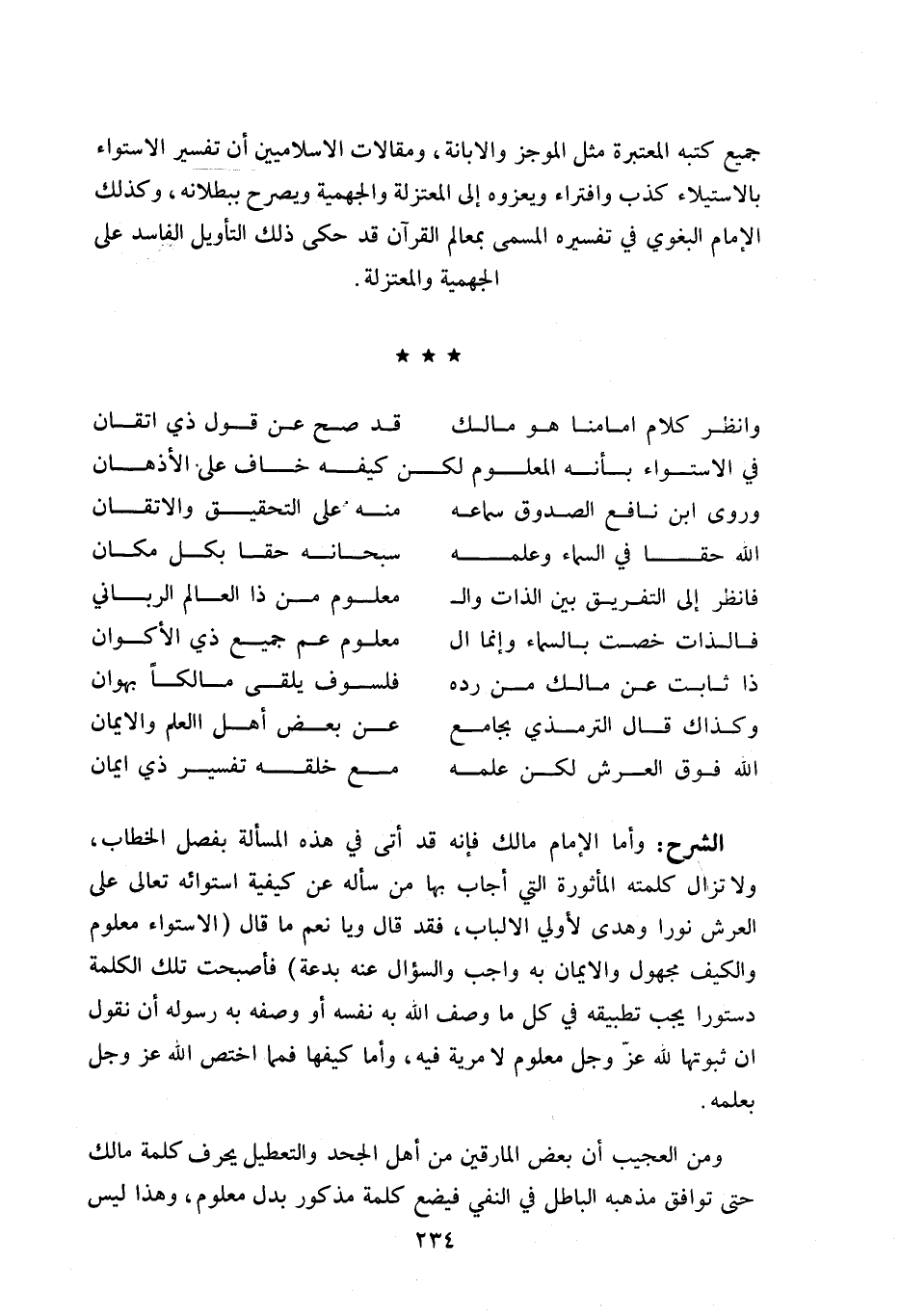 وأما الإمام مالك فإنه قد أتى في هذه المسألة بفصل الخطاب، ولا تزال كلمته المأثورة التي أجاب بها من سأله عن كيفية استوائه تعالى على العرش نورا وهدى لأولي الالباب، فقد قال ويا نعم ما قال (الاستواء معلوم والكيف مجهول والايمان به واجب والسؤال عنه بدعة) فأصبحت تلك الكلمة دستورا يجب تطبيقه في كل ما وصف اللّه به نفسه أو وصفه به رسوله أن نقول ان ثبوتها للّه عزّ وجل معلوم لا مرية فيه، وأما كيفها فمما اختص اللّه عز وجل بعلمه.
