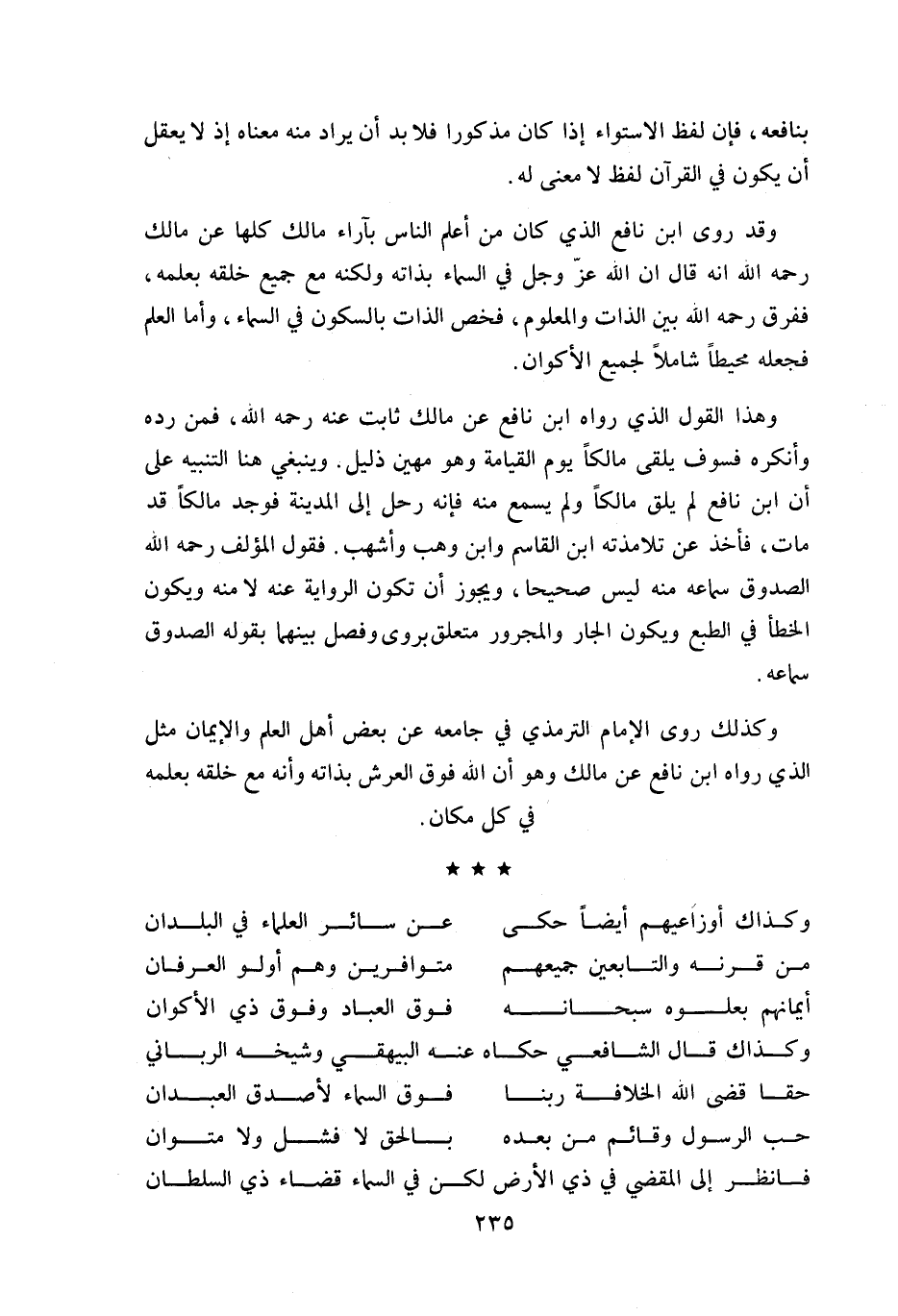 و قد روى ابن نافع الذي كان من أعلم الناس بآراء مالك كلها عن مالك رحمه اللّه انه قال ان اللّه عزّ وجل في السماء بذاته ولكنه مع جميع خلقه بعلمه، ففرق رحمه اللّه بين الذات والمعلوم، فخص الذات بالسكون في السماء، وأما العلم فجعله محيطا شاملا لجميع الأكوان.