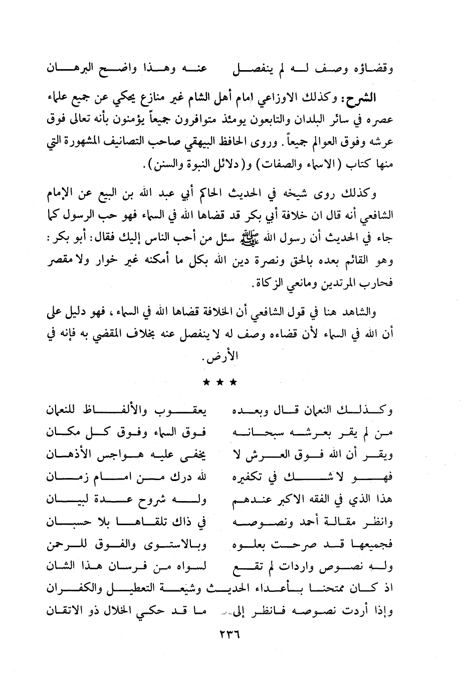 وكذلك الأوزاعي امام أهل الشام غير منازع يحكي عن جميع علماء عصره في سائر البلدان والتابعون يومئذ متوافرون جميعا يؤمنون بأنه تعالى فوق عرشه وفوق العوالم جميعا. وروى الحافظ البيهقي صاحب التصانيف المشهورة التي منها كتاب (الاسماء والصفات) و (دلائل النبوة والسنن).
