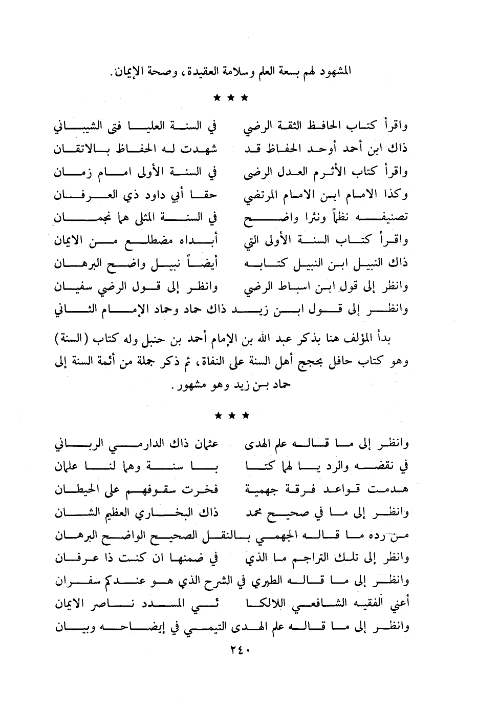 وانظر إلى قول ابن زيد ذاك حماد وحماد الإمام الثاني بدأ المؤلف هنا بذكر عبد اللّه بن الإمام أحمد بن حنبل وله كتاب (السنة) وهو كتاب حافل بحجج أهل السنة على النفاة، ثم ذكر جملة من أئمة السنة إلى حماد بن زيد وهو مشهور.