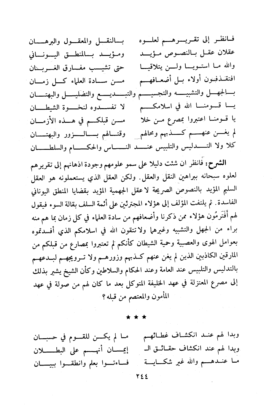 فانظر ان شئت دليلا على سمو علومهم وجودة اذهانهم إلى تقريرهم لعلوه سبحانه ببراهين النقل والعقل. ولكن العقل الذي يستعملونه هو العقل السليم المؤيد بالنصوص الصريحة لا عقل الجهمية المؤيد بقضايا المنطق اليوناني الفاسدة. ثم يلتفت المؤلف إلى هؤلاء المجترئين على أئمة السلف بقالة السوء فيقول لهم أ فترمون هؤلاء ممن ذكرنا وأضعافهم من سادة العلماء في كل زمان بما هم منه براء من الجهل والتشبيه وغيرهما ولا تتقون اللّه في اسلامكم الذي أفسدتموه بعوامل الهوى والعصبية وحمية الشيطان كأنكم لم تعتبروا بمصارع من قبلكم من المارقين الكاذبين الذين لم يغن عنهم كذبهم وزورهم ولا ترويجهم لبدعهم بالتدليس والتلبيس عند العامة وعند الحكام والسلاطين وكأن الشيخ يشير بذلك إلى مصرع المعتزلة في عهد الخليفة المتوكل بعد ما كان لهم من صولة في عهد المأمون والمعتصم من قبله؟