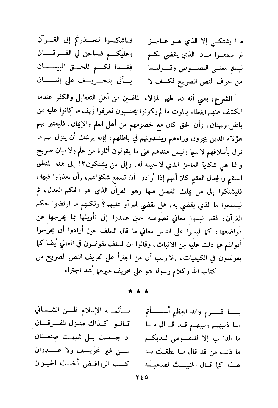 يعني أنه قد ظهر لهؤلاء الماضين من أهل التعطيل والكفر عند ما انكشف عنهم الغطاء بالموت ما لم يكونوا يحتسبون فعرفوا زيف ما كانوا عليه من باطل وبهتان، وأن الحق كان مع خصومهم من أهل العلم والإيمان. فليعتبر بهم هؤلاء الذين يجرون وراءهم ويقلدونهم في باطلهم، فإنه يوشك أن ينزل بهم ما نزل بأسلافهم لا سيما وليس عندهم على ما يقولون أثارة من علم ولا بيان صريح وانما هي شكاية العاجز الذي لا حيلة له. وإلى من يشتكون؟! إلى هذا المنطق السقيم والجدل العقيم كلا أنهم إذا أرادوا أن تسمع شكواهم، وأن يعذروا فيها، فليشتكوا إلى من يملك الفصل فيها وهو القرآن الذي هو الحكم العدل، ثم ليسمعوا ما الذي يقضي به، هل يقضي لهم أو عليهم؟ ولكنهم ما ارتضوا حكم القرآن، فقد لبسوا معاني نصوصه حين عمدوا إلى تأويلها بما يخرجها عن مواضعها، كما لبسوا على الناس معاني ما قال السلف حين أرادوا أن يخرجوا أقوالهم عما دلت عليه من الاثبات، وقالوا ان السلف يفوضون في المعاني أيضا كما يفوضون في الكيفيات، ولا ريب أن من اجترأ على تحريف النص الصريح من كتاب اللّه وكلام رسوله هو على تحريف غيرهما أشد اجتراء.