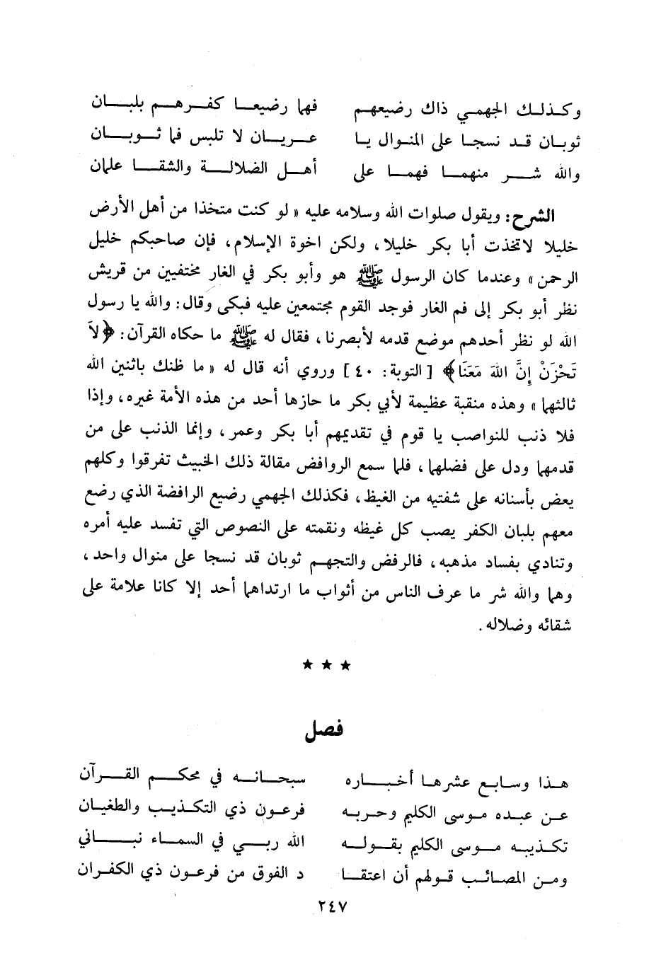 ويقول صلوات اللّه وسلامه عليه «لو كنت متخذا من أهل الأرض خليلا لاتخذت أبا بكر خليلا، ولكن اخوة الإسلام، فإن صاحبكم خليل الرحمن» وعند ما كان الرسول صلّى اللّه عليه وسلّم هو وأبو بكر في الغار مختفيين من قريش نظر أبو بكر إلى فم الغار فوجد القوم مجتمعين عليه فبكى وقال: واللّه يا رسول اللّه لو نظر أحدهم موضع قدمه لأبصرنا، فقال له صلّى اللّه عليه وسلّم ما حكاه القرآن: لا تَحْزَنْ إِنَّ اللَّهَ مَعَنا [التوبة: 40] وروي أنه قال له «ما ظنك باثنين اللّه ثالثهما» وهذه منقبة عظيمة لأبي بكر ما حازها أحد من هذه الأمة غيره، وإذا فلا ذنب للنواصب يا قوم في تقديمهم أبا بكر وعمر، وإنما الذنب على من قدمهما ودل على فضلهما، فلما سمع الروافض مقالة ذلك الخبيث تفرقوا وكلهم يعض بأسنانه على شفتيه من الغيظ، فكذلك الجهمي رضيع الرافضة الذي رضع معهم بلبان الكفر يصب كل غيظه ونقمته على النصوص التي تفسد عليه أمره وتنادي بفساد مذهبه، فالرفض والتجهم ثوبان قد نسجا على منوال واحد، وهما واللّه شر ما عرف الناس من أثواب ما ارتداهما أحد إلا كانا علامة على شقائه وضلاله.