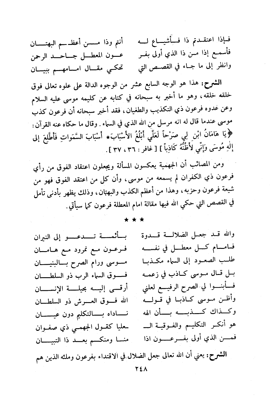 و من المصائب أن الجهمية يعكسون المسألة ويجعلون اعتقاد الفوق من رأي فرعون ذي الكفران لم يسمعه من موسى، وأن كل من اعتقد الفوق فهو من شيعة فرعون وحزبه، وهذا من أعظم الكذب والبهتان، وذلك يظهر بأدنى تأمل في القصص التي حكي اللّه فيها مقالة امام المعطلة فرعون كما سيأتي.