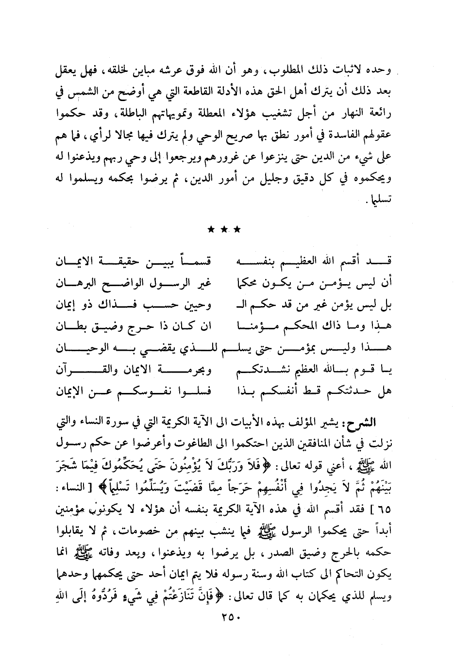 يشير المؤلف بهذه الأبيات الى الآية الكريمة التي في سورة النساء والتي نزلت في شأن المنافقين الذين احتكموا الى الطاغوت وأعرضوا عن حكم رسول اللّه صلّى اللّه عليه وسلّم، أعني قوله تعالى: فَلا ورَبِّكَ لا يُؤْمِنُونَ حَتَّى يُحَكِّمُوكَ فِيما شَجَرَ بَيْنَهُمْ ثُمَّ لا يَجِدُوا فِي أَنْفُسِهِمْ حَرَجاً مِمَّا قَضَيْتَ ويُسَلِّمُوا تَسْلِيماً [النساء: