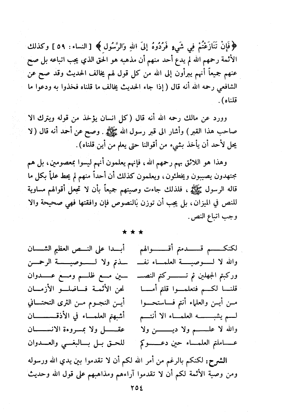 فَإِنْ تَنازَعْتُمْ فِي شَيْ ءٍ فَرُدُّوهُ إِلَى اللَّهِ والرَّسُولِ [النساء: 59] وكذلك الأئمة رحمهم اللّه لم يدع أحد منهم أن مذهبه هو الحق الذي يجب اتباعه بل صح عنهم جميعا أنهم يبرءون إلى اللّه من كل قول لهم يخالف الحديث وقد صح عن الشافعي رحمه اللّه أنه قال (إذا جاء الحديث يخالف ما قلناه فخذوا به ودعوا ما قلناه).