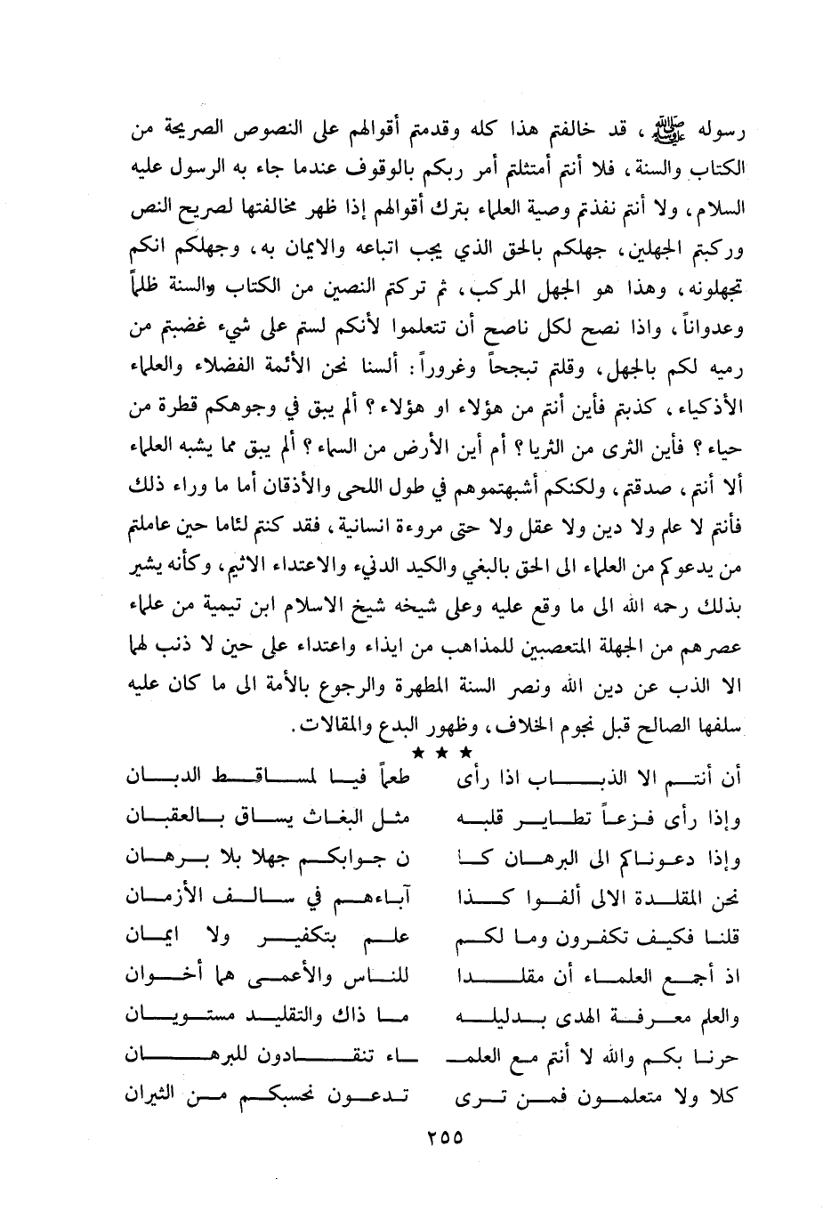 رسوله صلّى اللّه عليه وسلّم، قد خالفتم هذا كله وقدمتم أقوالهم على النصوص الصريحة من الكتاب والسنة، فلا أنتم امتثلتم أمر ربكم بالوقوف عند ما جاء به الرسول عليه السلام، ولا أنتم نفذتم وصية العلماء بترك أقوالهم إذا ظهر مخالفتها لصريح النص وركبتم الجهلين، جهلكم بالحق الذي يجب اتباعه والايمان به، وجهلكم انكم تجهلونه، وهذا هو الجهل المركب، ثم تركتم النصين من الكتاب والسنة ظلما وعدوانا، واذا نصح لكل ناصح أن تتعلموا لأنكم لستم على شي ء غضبتم من رميه لكم بالجهل، وقلتم تبجحا وغرورا: ألسنا نحن الأئمة الفضلاء والعلماء الأذكياء، كذبتم فأين أنتم من هؤلاء او هؤلاء؟ أ لم يبق في وجوهكم قطرة من حياء؟ فأين الثرى من الثريا؟ أم أين الأرض من السماء؟ أ لم يبق مما يشبه العلماء ألا أنتم، صدقتم، ولكنكم أشبهتموهم في طول اللحى والأذقان أما ما وراء ذلك فأنتم لا علم ولا دين ولا عقل ولا حتى مروءة انسانية، فقد كنتم لئاما حين عاملتم من يدعوكم من العلماء الى الحق بالبغي والكيد الدني ء والاعتداء الاثيم، وكأنه يشير بذلك رحمه اللّه الى ما وقع عليه وعلى شيخه شيخ الاسلام ابن تيمية من علماء عصرهم من الجهلة المتعصبين للمذاهب من ايذاء واعتداء على حين لا ذنب لهما الا الذب عن دين اللّه ونصر السنة المطهرة والرجوع بالأمة الى ما كان عليه سلفها الصالح قبل نجوم الخلاف، وظهور البدع والمقالات.