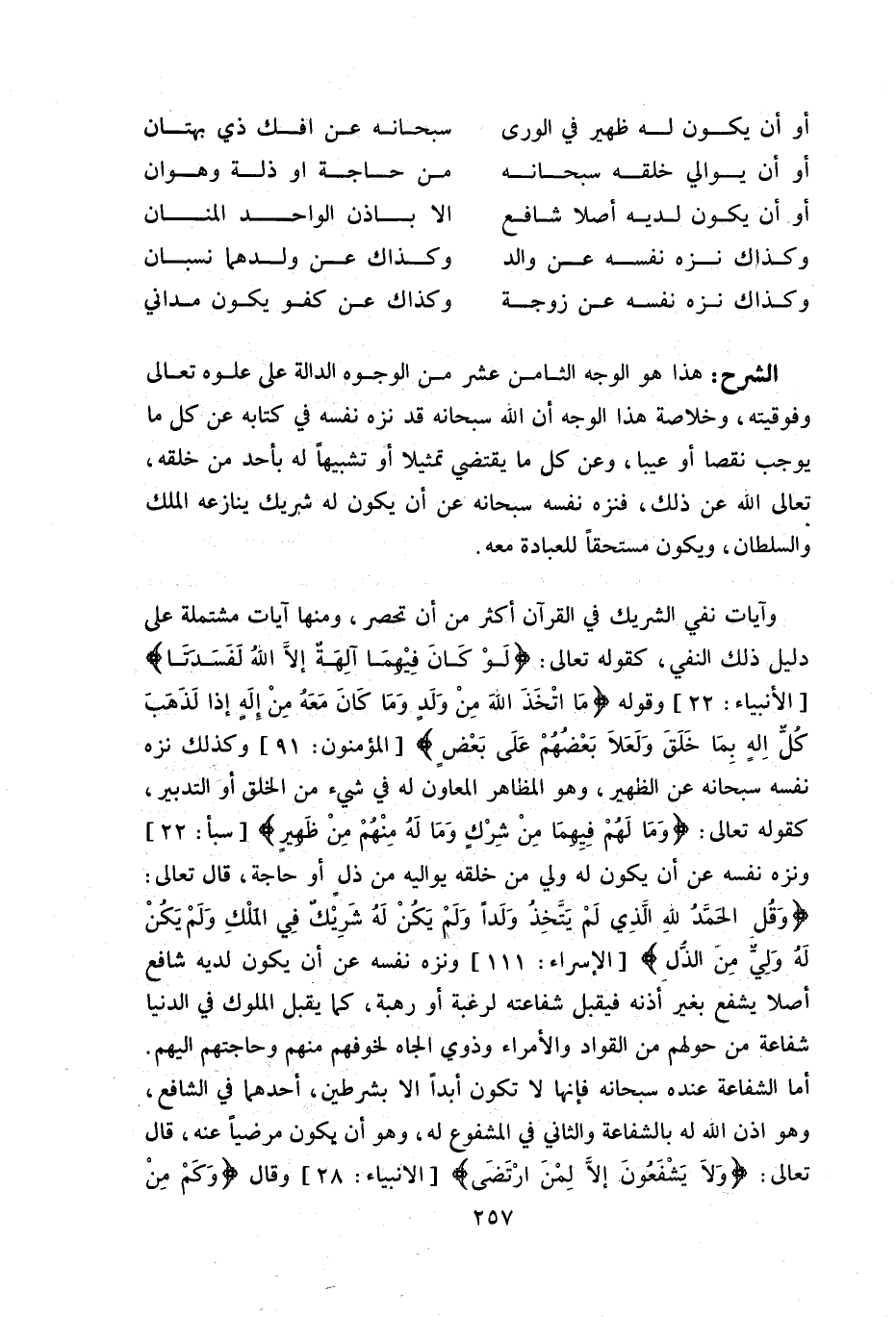 و آيات نفي الشريك في القرآن أكثر من أن تحصر، ومنها آيات مشتملة على دليل ذلك النفي، كقوله تعالى: لَوْ كانَ فِيهِما آلِهَةٌ إِلَّا اللَّهُ لَفَسَدَتا [الأنبياء: 22] وقوله مَا اتَّخَذَ اللَّهُ مِنْ وَلَدٍ وما كانَ مَعَهُ مِنْ إِلهٍ إِذاً لَذَهَبَ كُلُّ إِلهٍ بِما خَلَقَ ولَعَلا بَعْضُهُمْ عَلى بَعْضٍ [المؤمنون: 91] وكذلك نزه نفسه سبحانه عن الظهير، وهو المظاهر المعاون له في شي ء من الخلق أو التدبير، كقوله تعالى: وما لَهُمْ فِيهِما مِنْ شِرْكٍ وما لَهُ مِنْهُمْ مِنْ ظَهِيرٍ [سبأ: 22] ونزه نفسه عن أن يكون له ولي من خلقه يواليه من ذل أو حاجة، قال تعالى: