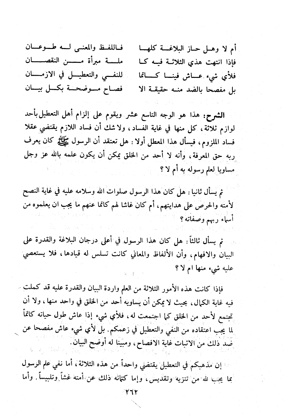 إن مذهبكم في التعطيل يقتضي واحدا من هذه الثلاثة، أما نفي علم الرسول بما يجب للّه من تنزيه وتقديس، وأما كتمانه ذلك عن أمته غشا وتلبيسا. وأما