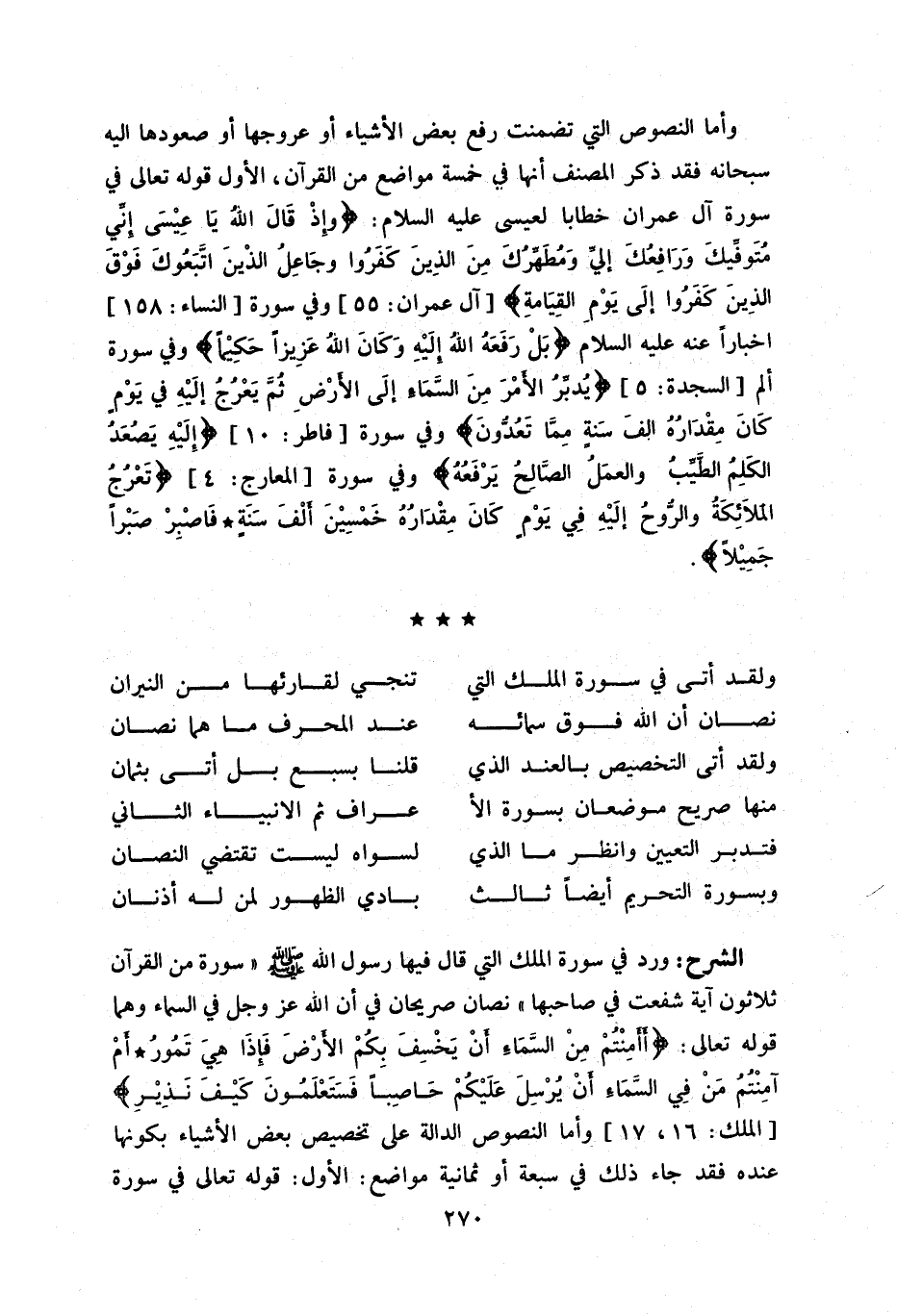 و أما النصوص التي تضمنت رفع بعض الأشياء أو عروجها أو صعودها إليه سبحانه فقد ذكر المصنف أنها في خمسة مواضع من القرآن، الأول قوله تعالى في سورة آل عمران خطابا لعيسى عليه السلام: إِذْ قالَ اللَّهُ يا عِيسى إِنِّي مُتَوَفِّيكَ ورافِعُكَ إِلَيَّ ومُطَهِّرُكَ مِنَ الَّذِينَ كَفَرُوا وجاعِلُ الَّذِينَ اتَّبَعُوكَ فَوْقَ الَّذِينَ كَفَرُوا إِلى يَوْمِ الْقِيامَةِ [آل عمران: 55] وفي سورة [النساء: 158] اخبارا عنه عليه السلام بَلْ رَفَعَهُ اللَّهُ إِلَيْهِ وكانَ اللَّهُ عَزِيزاً حَكِيماً وفي سورة الم [السجدة: 5] يُدَبِّرُ الْأَمْرَ مِنَ السَّماءِ إِلَى الْأَرْضِ ثُمَّ يَعْرُجُ إِلَيْهِ فِي يَوْمٍ كانَ مِقْدارُهُ أَلْفَ سَنَةٍ مِمَّا تَعُدُّونَ وفي سورة [فاطر: 10] إِلَيْهِ يَصْعَدُ الْكَلِمُ الطَّيِّبُ والْعَمَلُ الصَّالِحُ يَرْفَعُهُ وفي سورة [المعارج: 4] تَعْرُجُ الْمَلائِكَةُ والرُّوحُ إِلَيْهِ فِي يَوْمٍ كانَ مِقْدارُهُ خَمْسِينَ أَلْفَ سَنَةٍ* فَاصْبِرْ صَبْراً جَمِيلًا.