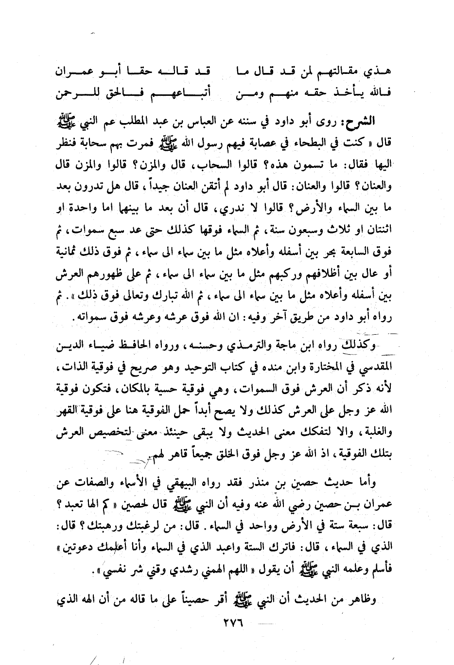 روى أبو داود في سننه عن العباس بن عبد المطلب عم النبي صلّى اللّه عليه وسلّم قال «كنت في البطحاء في عصابة فيهم رسول اللّه صلّى اللّه عليه وسلّم فمرت بهم سحابة فنظر إليها فقال: ما تسمون هذه؟ قالوا السحاب، قال والمزن؟ قالوا والمزن قال والعنان؟ قالوا والعنان: قال أبو داود لم أتقن العنان جيدا، قال هل تدرون بعد ما بين السماء والأرض؟ قالوا لا ندري، قال أن بعد ما بينهما اما واحدة او اثنتان او ثلاث وسبعون سنة، ثم السماء فوقها كذلك حتى عد سبع سماوات، ثم فوق السابعة بحر بين أسفله وأعلاه مثل ما بين سماء الى سماء، ثم فوق ذلك ثمانية أو عال بين أظلافهم وركبهم مثل ما بين سماء الى سماء، ثم على ظهورهم العرش بين أسفله وأعلاه مثل ما بين سماء الى سماء، ثم اللّه تبارك وتعالى فوق ذلك». ثم رواه أبو داود من طريق آخر وفيه: ان اللّه فوق عرشه وعرشه فوق سماواته.