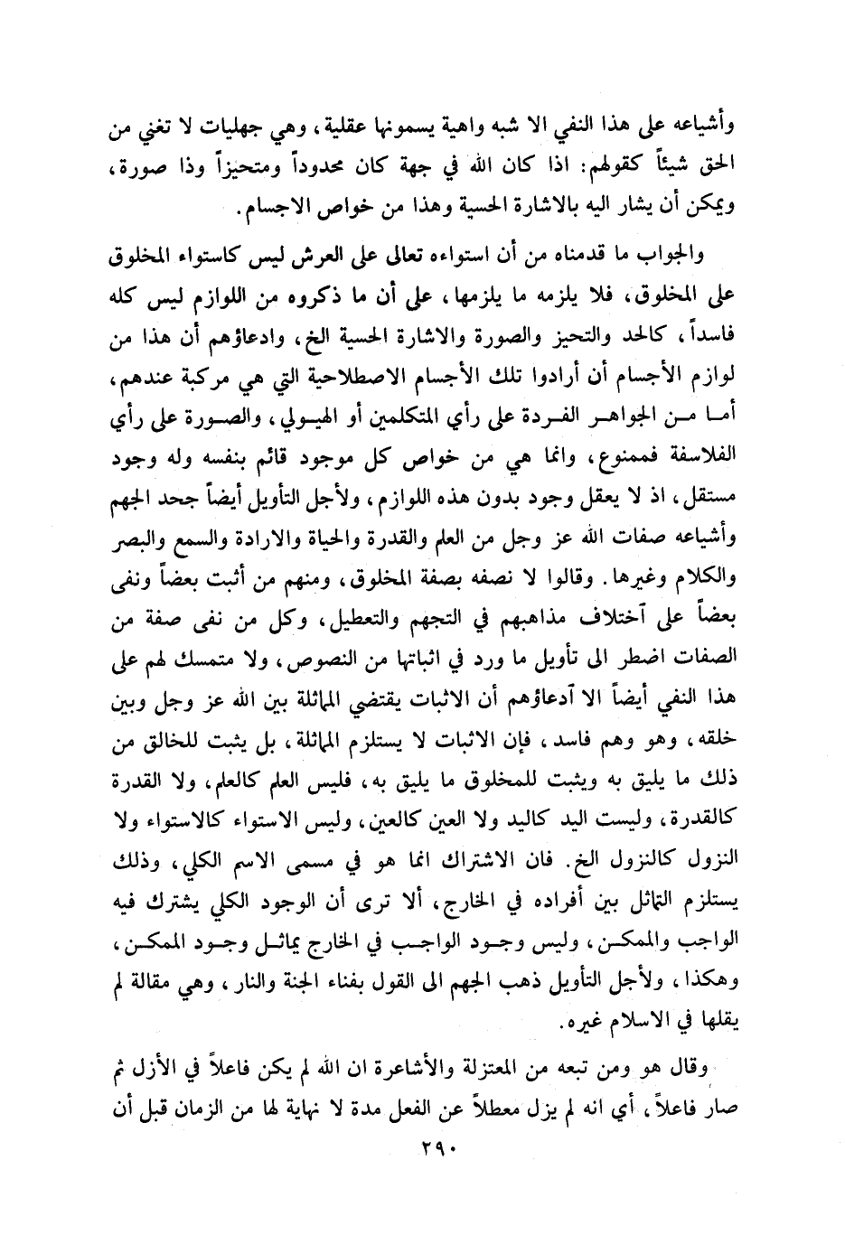و الجواب ما قدمناه من أن استواءه تعالى على العرش ليس كاستواء المخلوق على المخلوق، فلا يلزمه ما يلزمها، على أن ما ذكروه من اللوازم ليس كله فاسدا، كالحد والتحيز والصورة والاشارة الحسية الخ، وادعاؤهم أن هذا من لوازم الأجسام أن أرادوا تلك الأجسام الاصطلاحية التي هي مركبة عندهم، أما من الجواهر الفردة على رأي المتكلمين أو الهيولي، والصورة على رأي الفلاسفة فممنوع، وانما هي من خواص كل موجود قائم بنفسه وله وجود مستقل، اذ لا يعقل وجود بدون هذه اللوازم، ولأجل التأويل أيضا جحد الجهم وأشياعه صفات اللّه عز وجل من العلم والقدرة والحياة والإرادة والسمع والبصر والكلام وغيرها. وقالوا لا نصفه بصفة المخلوق، ومنهم من أثبت بعضا ونفى بعضا على اختلاف مذاهبهم في التجهم والتعطيل، وكل من نفى صفة من الصفات اضطر الى تأويل ما ورد في اثباتها من النصوص، ولا متمسك لهم على هذا النفي أيضا الا ادعاؤهم أن الاثبات يقتضي المماثلة بين اللّه عز وجل وبين خلقه، وهو وهم فاسد، فإن الاثبات لا يستلزم المماثلة، بل يثبت للخالق من ذلك ما يليق به ويثبت للمخلوق ما يليق به، فليس العلم كالعلم، ولا القدرة كالقدرة، وليست اليد كاليد ولا العين كالعين، وليس الاستواء كالاستواء ولا النزول كالنزول الخ. فان الاشتراك انما هو في مسمى الاسم الكلي، وذلك يستلزم التماثل بين أفراده في الخارج، ألا ترى أن الوجود الكلي يشترك فيه الواجب والممكن، وليس وجود الواجب في الخارج يماثل وجود الممكن، وهكذا، ولأجل التأويل ذهب الجهم الى القول بفناء الجنة والنار، وهي مقالة لم يقلها في الاسلام غيره.