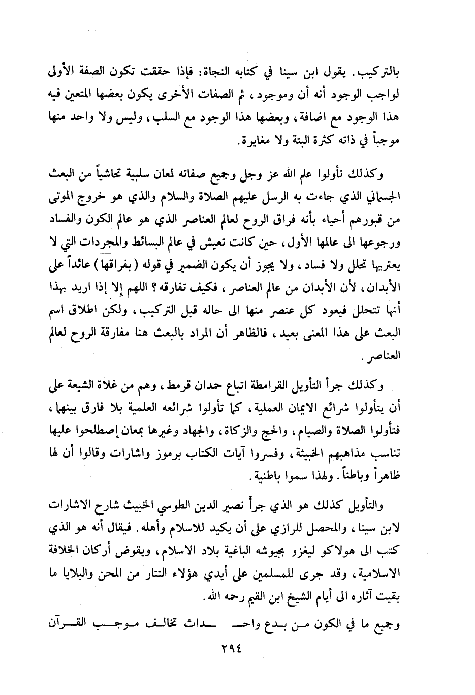و التأويل كذلك هو الذي جرأ نصير الدين الطوسي الخبيث شارح الاشارات لابن سينا، والمحصل للرازي على أن يكيد للاسلام وأهله. فيقال أنه هو الذي كتب الى هولاكو ليغزو بجيوشه الباغية بلاد الاسلام، ويقوض أركان الخلافة الاسلامية، وقد جرى للمسلمين على أيدي هؤلاء التتار من المحن والبلايا ما بقيت آثاره الى أيام الشيخ ابن القيم رحمه اللّه.