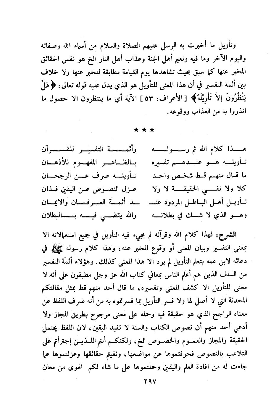 فهذا كلام اللّه وقرآنه لم يجي ء فيه التأويل في جميع استعمالاته الا بمعنى التفسير وبيان المعنى أو وقوع المخبر عنه، وهذا كلام رسوله صلّى اللّه عليه وسلّم في دعائه لابن عمه بتعلم التأويل لم يرد الا هذا المعنى كذلك. وهؤلاء أئمة التفسير من السلف الذين هم أعلم الناس بمعاني كتاب اللّه عز وجل مطبقون على أنه لا معنى للتأويل الا كشف المعنى وتفسيره، ما قال أحد منهم قط بمثل مقالتكم المحدثة التي لا أصل لها ولا فسر التأويل بما فسرتموه به من أنه صرف اللفظ عن معناه الراجح الذي هو حقيقة فيه وحمله على معنى مرجوح بطريق المجاز ولا أدعي أحد منهم أن نصوص الكتاب والسنة لا تفيد اليقين، لان اللفظ يحتمل الحقيقة والمجاز والعموم والخصوص الخ، ولكنكم أنتم اللذين اجترأتم على التلاعب بالنصوص فحرفتموها عن مواضعها، ونفيتم حقائقها وعزلتموها عما جاءت له من افادة العلم واليقين وحملتموها على ما شاء لكم الهوى من معان