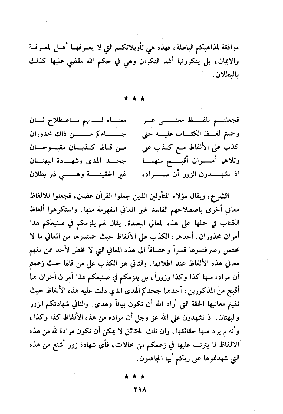 ويقال لهؤلاء المتأولين الذين جعلوا القرآن عضين، فجعلوا للالفاظ معاني أخرى باصطلاحهم الفاسد غير المعاني المفهومة منها، واستكرهوا ألفاظ الكتاب في حملها على هذه المعاني البعيدة. يقال لهم يلزمكم في صنيعكم هذا أمران محذوران. أحدهما: الكذب على الألفاظ حيث حملتموها من المعاني ما لا تحتمل وصرفتموها قسرا واعتسافا الى هذه المعاني التي لا تخطر لأحد ممن يفهم معاني هذه الألفاظ عند اطلاقها. والثاني هو الكذب على من قالها حيث زعمتم أن مراده منها كذا وكذا وزورا، بل يلزمكم في صنيعكم هذا أمران آخران هما أقبح من المذكورين، أحدهما جحدكم الهدى الذي دلت عليه هذه الألفاظ حيث نفيتم معانيها الحقة التي أراد اللّه أن تكون بيانا وهدى. والثاني شهادتكم الزور والبهتان. اذ تشهدون على اللّه عز وجل أن مراده من هذه الألفاظ كذا وكذا، وأنه لم يرد منها حقائقها، وان تلك الحقائق لا يمكن أن تكون مرادة للّه من هذه الالفاظ لما يترتب عليها في زعمكم من محالات، فأي شهادة زور أشنع من هذه التي شهدتموها على ربكم أنها الجاهلون.