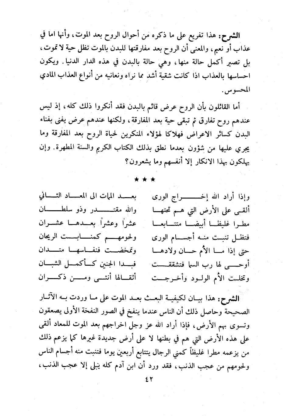 أما القائلون بأن الروح عرض قائم بالبدن فقد أنكروا ذلك كله، إذ ليس عندهم روح تفارق ثم تبقى حية بعد المفارقة، ولكنها عندهم عرض يفنى بفناء البدن كسائر الاعراض فهلاكا لهؤلاء المنكرين لحياة الروح بعد المفارقة وما يجري عليها من شئون بعد ما نطق بذلك الكتاب الكريم والسنة المطهرة. وإن يهلكون بهذا الانكار إلا أنفسهم وما يشعرون؟