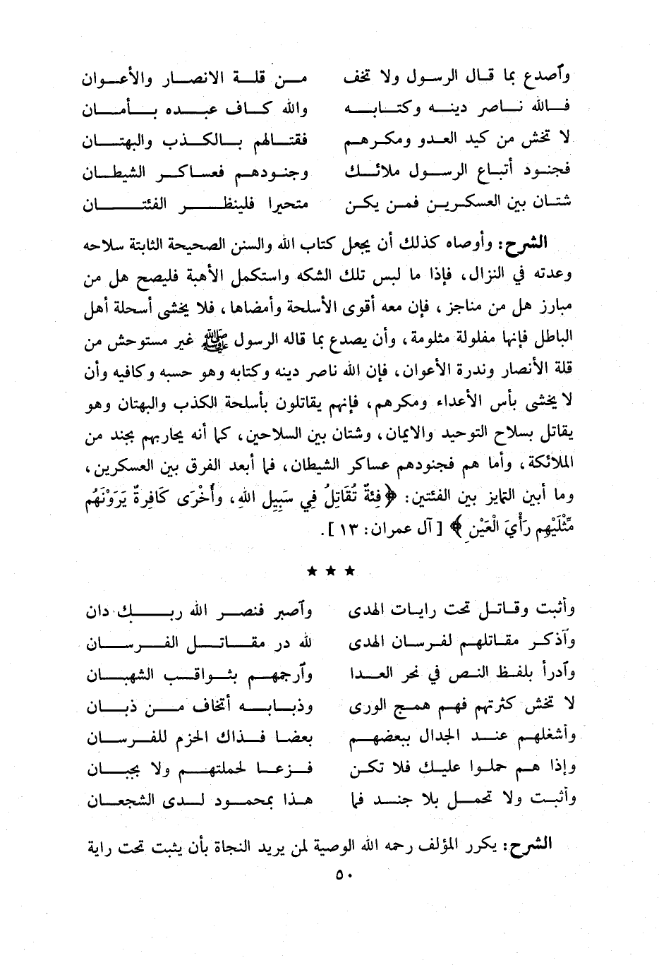وأوصاه كذلك أن يجعل كتاب اللّه والسنن الصحيحة الثابتة سلاحه وعدته في النزال، فإذا ما لبس تلك الشكه واستكمل الأهبة فليصح هل من مبارز هل من مناجز، فإن معه أقوى الأسلحة وأمضاها، فلا يخشى أسلحة أهل الباطل فإنها مفلولة مثلومة، وأن يصدع بما قاله الرسول صلّى اللّه عليه وسلّم غير مستوحش من قلة الأنصار وندرة الأعوان، فإن اللّه ناصر دينه وكتابه وهو حسبه وكافيه وأن لا يخشى بأس الأعداء ومكرهم، فإنهم يقاتلون بأسلحة الكذب والبهتان وهو يقاتل بسلاح التوحيد والايمان، وشتان بين السلاحين، كما أنه يحاربهم بجند من الملائكة، وأما هم فجنودهم عساكر الشيطان، فما أبعد الفرق بين العسكرين، وما أبين التمايز بين الفئتين: فِئَةٌ تُقاتِلُ فِي سَبِيلِ اللَّهِ، وأُخْرى كافِرَةٌ يَرَوْنَهُمْ مِثْلَيْهِمْ رَأْيَ الْعَيْنِ [آل عمران: 13].