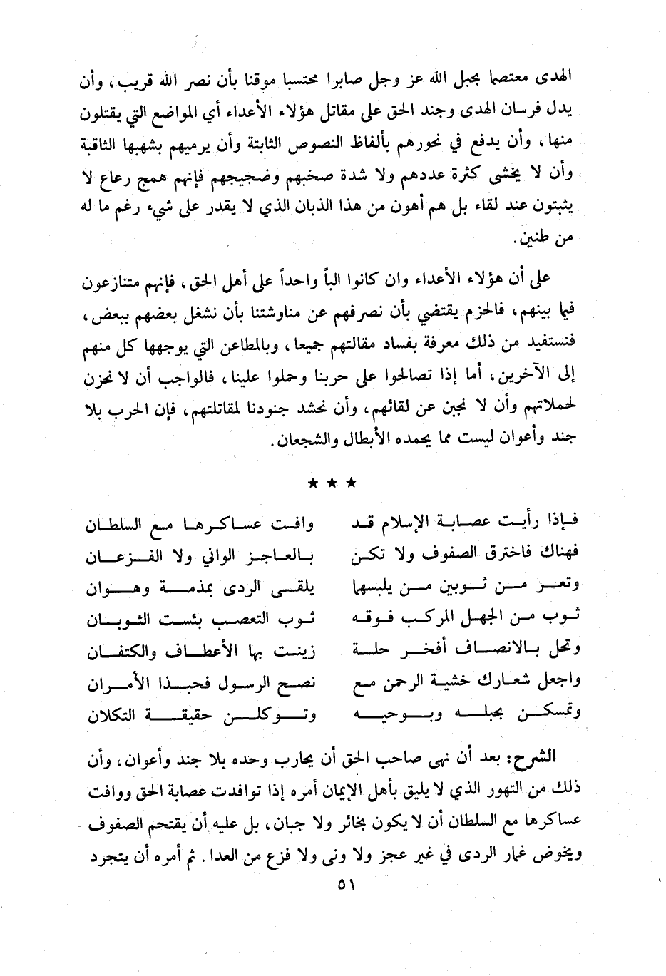 بعد أن نهى صاحب الحق أن يحارب وحده بلا جند وأعوان، وأن ذلك من التهور الذي لا يليق بأهل الإيمان أمره إذا توافدت عصابة الحق ووافت عساكرها مع السلطان أن لا يكون بخائر ولا جبان، بل عليه أن يقتحم الصفوف ويخوض غمار الردى في غير عجز ولا ونى ولا فزع من العدا. ثم أمره أن يتجرد