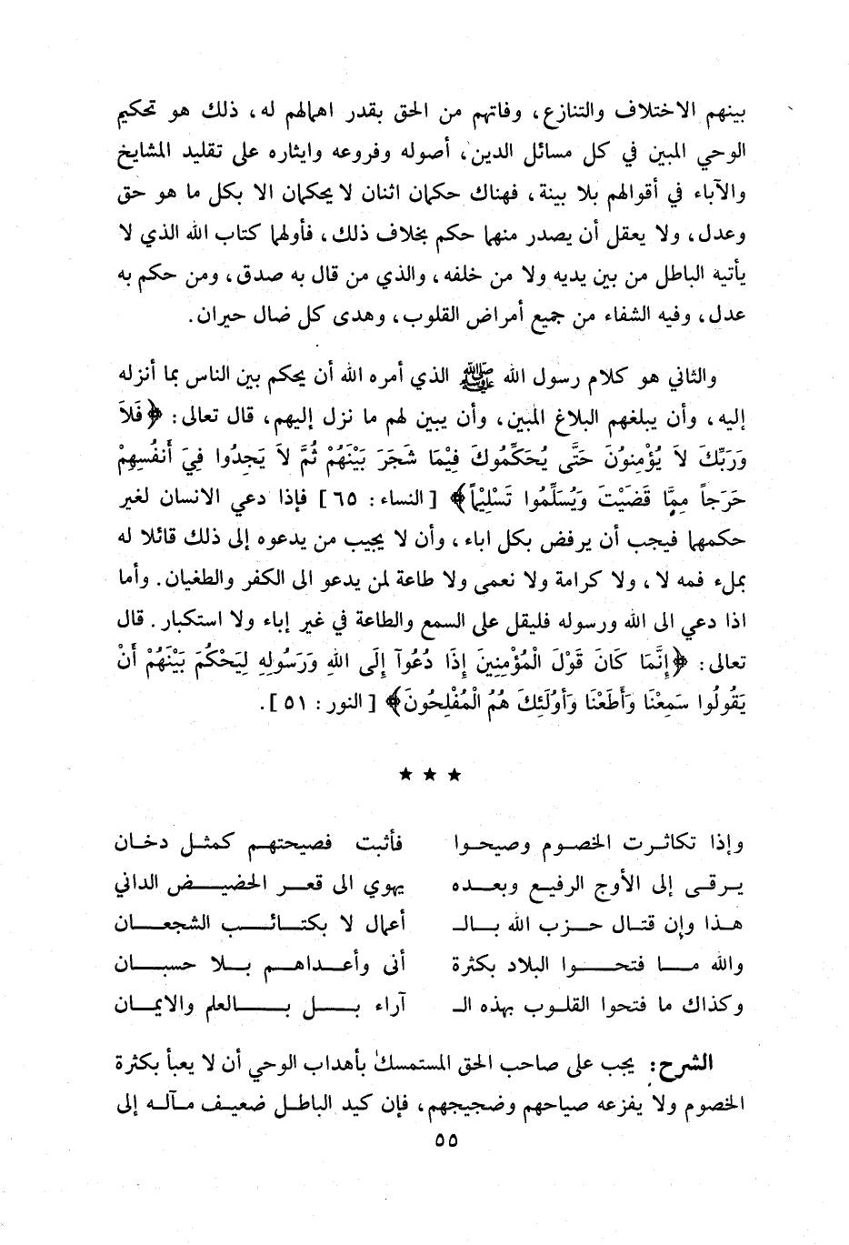 بينهم الاختلاف والتنازع، وفاتهم من الحق بقدر اهمالهم له، ذلك هو تحكيم الوحي المبين في كل مسائل الدين، أصوله وفروعه وايثاره على تقليد المشايخ والآباء في أقوالهم بلا بينة، فهناك حكمان اثنان لا يحكمان الا بكل ما هو حق وعدل، ولا يعقل أن يصدر منهما حكم بخلاف ذلك، فأولهما كتاب اللّه الذي لا يأتيه الباطل من بين يديه ولا من خلفه، والذي من قال به صدق، ومن حكم به عدل، وفيه الشفاء من جميع أمراض القلوب، وهدى كل ضال حيران.