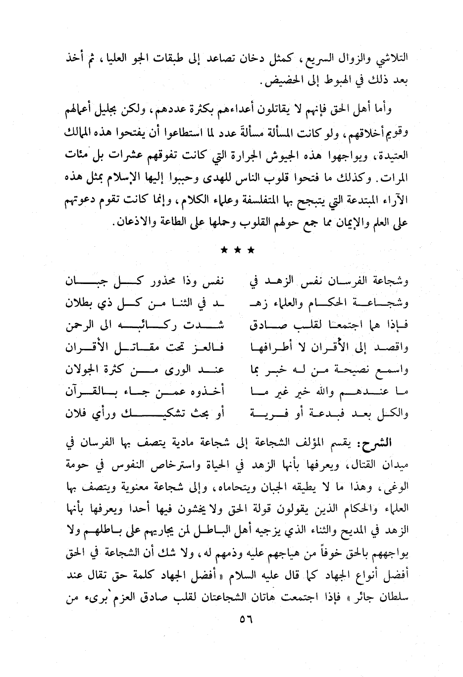 يقسم المؤلف الشجاعة إلى شجاعة مادية يتصف بها الفرسان في ميدان القتال، ويعرفها بأنها الزهد في الحياة واسترخاص النفوس في حومة الوغى، وهذا ما لا يطيقه الجبان ويتحاماه، وإلى شجاعة معنوية ويتصف بها العلماء والحكام الذين يقولون قولة الحق ولا يخشون فيها أحدا ويعرفها بأنها الزهد في المديح والثناء الذي يزجيه أهل الباطل لمن يجاريهم على باطلهم ولا يواجههم بالحق خوفا من هياجهم عليه وذمهم له، ولا شك أن الشجاعة في الحق أفضل أنواع الجهاد كما قال عليه السلام «أفضل الجهاد كلمة حق تقال عند سلطان جائر» فإذا اجتمعت هاتان الشجاعتان لقلب صادق العزم بري ء من