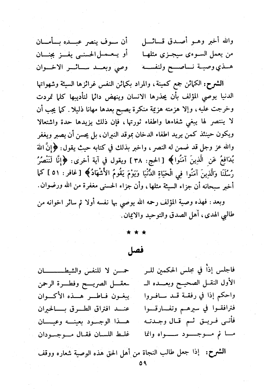 الكمائن جمع كمينة، والمراد بكمائن النفس غرائزها السيئة وشهواتها الدنيا يوصي المؤلف بأن يحذرها الانسان وينهض دائما لتأديبها كلما تمردت وخرجت عليه، وإلا هزمته هزيمة منكرة يصبح بعدها مهانا ذليلا. كما يجب أن لا ينتصر لها يبغي شفاءها واطفاء ثورتها، فإن ذلك يزيدها حدة واشتعالا ويكون حينئذ كمن يريد اطفاء الدخان بموقد النيران، بل يحسن أن يصبر ويغفر واللّه عز وجل قد ضمن له النصر، واخبر بذلك في كتابه حيث يقول: إِنَّ اللَّهَ يُدافِعُ عَنِ الَّذِينَ آمَنُوا [الحج: 38] ويقول في آية أخرى: إِنَّا لَنَنْصُرُ رُسُلَنا والَّذِينَ آمَنُوا فِي الْحَياةِ الدُّنْيا ويَوْمَ يَقُومُ الْأَشْهادُ [غافر: 51] كما أخبر سبحانه أن جزاء السيئة مثلها، وأن جزاء الحسنى مغفرة من اللّه ورضوان.