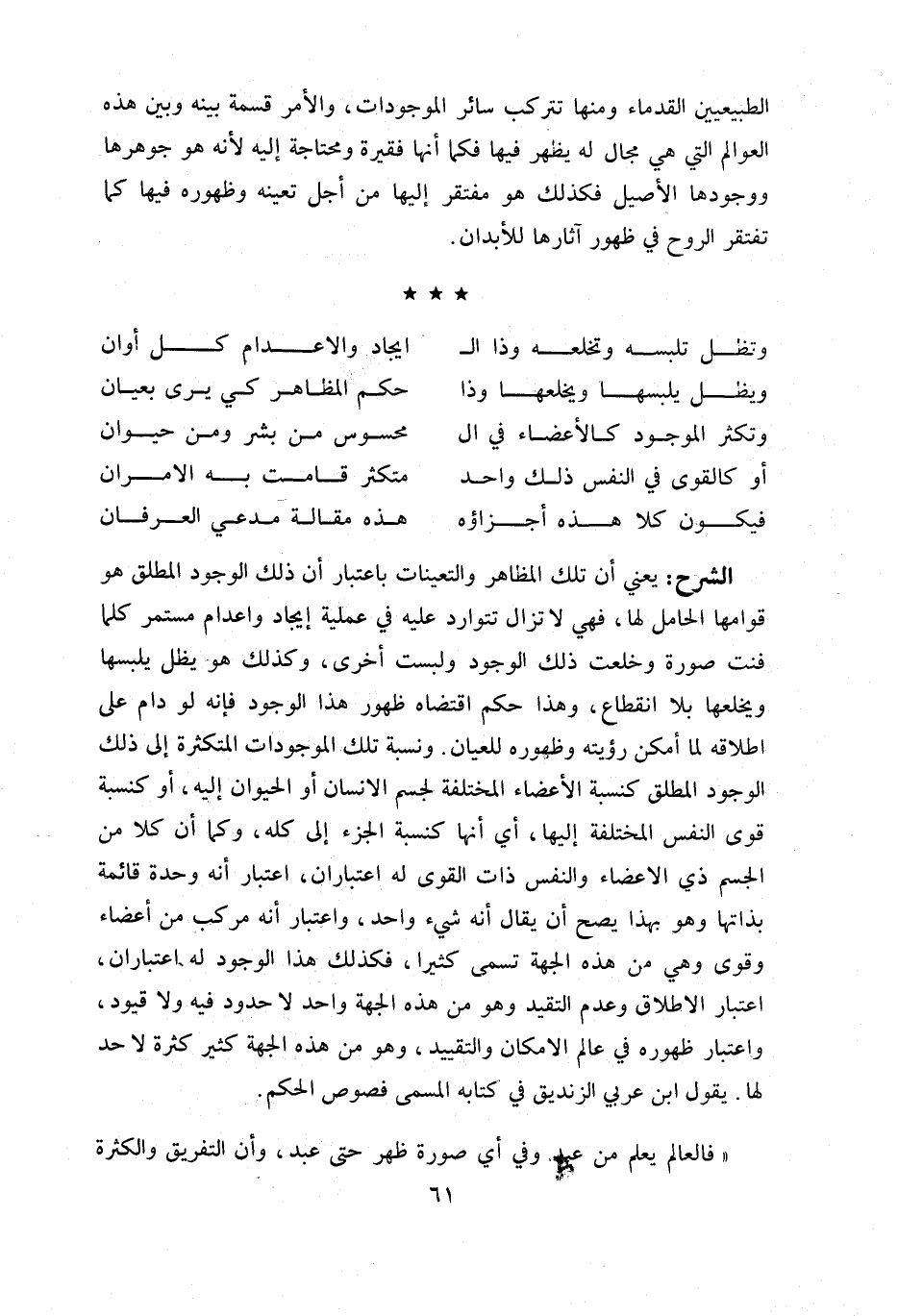 يعني أن تلك المظاهر والتعينات باعتبار أن ذلك الوجود المطلق هو قوامها الحامل لها، فهي لا تزال تتوارد عليه في عملية إيجاد واعدام مستمر كلما فنت صورة وخلعت ذلك الوجود ولبست أخرى، وكذلك هو يظل يلبسها ويخلعها بلا انقطاع، وهذا حكم اقتضاه ظهور هذا الوجود فإنه لو دام على اطلاقه لما أمكن رؤيته وظهوره للعيان. ونسبة تلك الموجودات المتكثرة إلى ذلك الوجود المطلق كنسبة الأعضاء المختلفة لجسم الانسان أو الحيوان إليه، أو كنسبة قوى النفس المختلفة إليها، أي أنها كنسبة الجزء إلى كله، وكما أن كلا من الجسم ذي الاعضاء والنفس ذات القوى له اعتباران، اعتبار أنه وحدة قائمة بذاتها وهو بهذا يصح أن يقال أنه شي ء واحد، واعتبار أنه مركب من أعضاء وقوى وهي من هذه الجهة تسمى كثيرا، فكذلك هذا الوجود له اعتباران، اعتبار الاطلاق وعدم التقييد وهو من هذه الجهة واحد لا حدود فيه ولا قيود، واعتبار ظهوره في عالم الامكان والتقييد، وهو من هذه الجهة كثير كثرة لا حد لها. يقول ابن عربي الزنديق في كتابه المسمى فصوص الحكم.