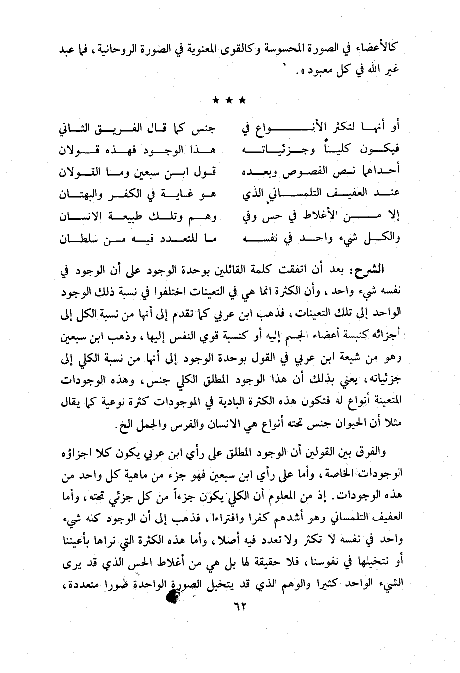 و الفرق بين القولين أن الوجود المطلق على رأي ابن عربي يكون كلا اجزاؤه الوجودات الخاتمة، وأما على رأي ابن سبعين فهو جزء من ماهية كل واحد من هذه الوجودات. إذ من المعلوم أن الكلي يكون جزءا من كل جزئي تحته، وأما العفيف التلمساني وهو أشدهم كفرا وافتراء، فذهب إلى أن الوجود كله شي ء واحد في نفسه لا تكثر ولا تعدد فيه أصلا، وأما هذه الكثرة التي نراها بأعيننا أو نتخيلها في نفوسنا، فلا حقيقة لها بل هي من أغلاط الحس الذي قد يرى الشي ء الواحد كثيرا والوهم الذي قد يتخيل الصورة الواحدة صورا متعددة،
