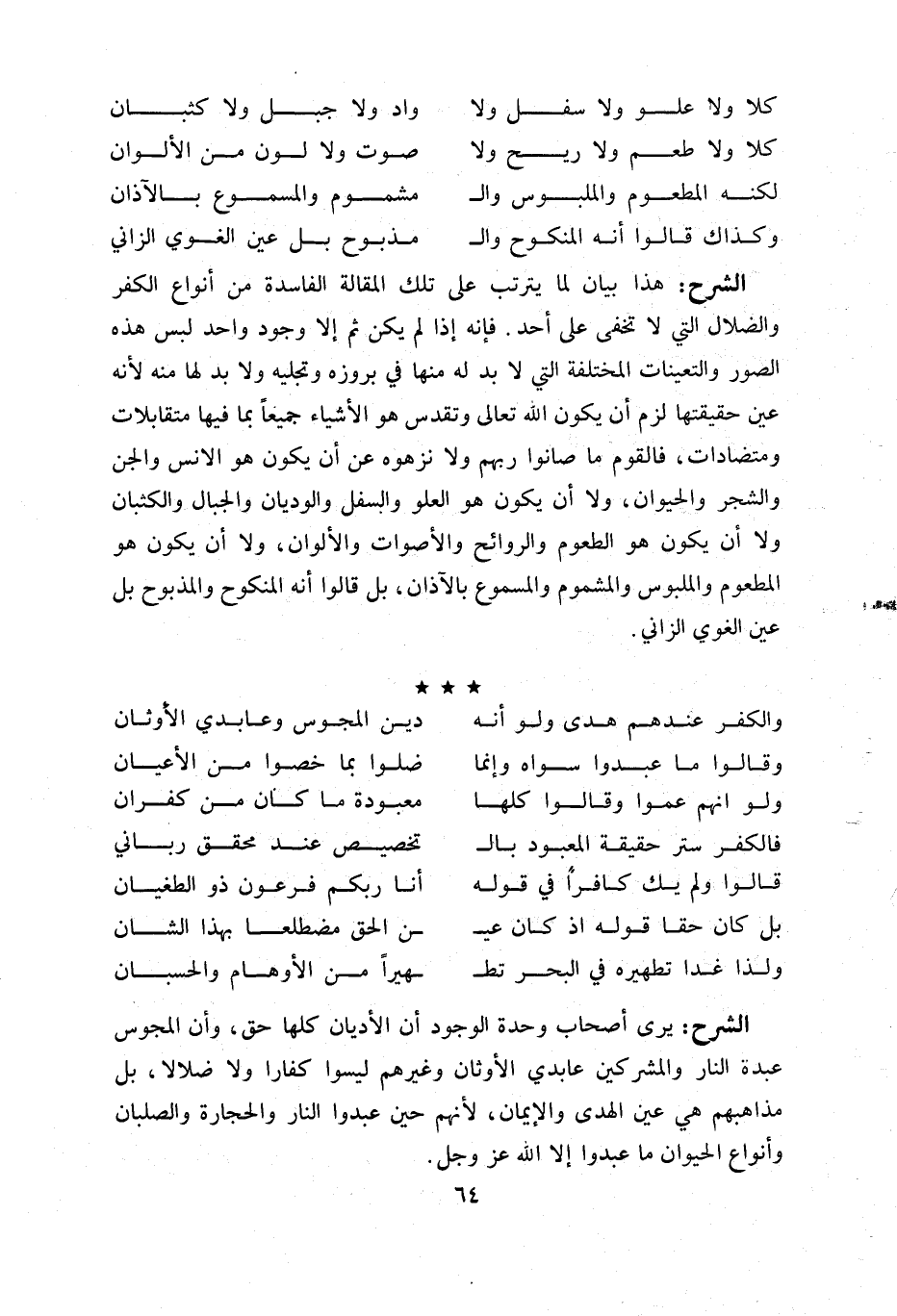 هذا بيان لما يترتب على تلك المقالة الفاسدة من أنواع الكفر والضلال التي لا تخفى على أحد. فإنه إذا لم يكن ثم إلا وجود واحد لبس هذه الصور والتعينات المختلفة التي لا بد له منها في بروزه وتجليه ولا بد لها منه لأنه عين حقيقتها لزم أن يكون اللّه تعالى وتقدس هو الأشياء جميعا بما فيها متقابلات ومتضادات، فالقوم ما صانوا ربهم ولا نزهوه عن أن يكون هو الانس والجن والشجر والحيوان، ولا أن يكون هو العلو والسفل والوديان والجبال والكثبان ولا أن يكون هو الطعوم والروائح والأصوات والألوان، ولا أن يكون هو المطعوم والملبوس والمشموم والمسموع بالآذان، بل قالوا أنه المنكوح والمذبوح بل عين الغوي الزاني.