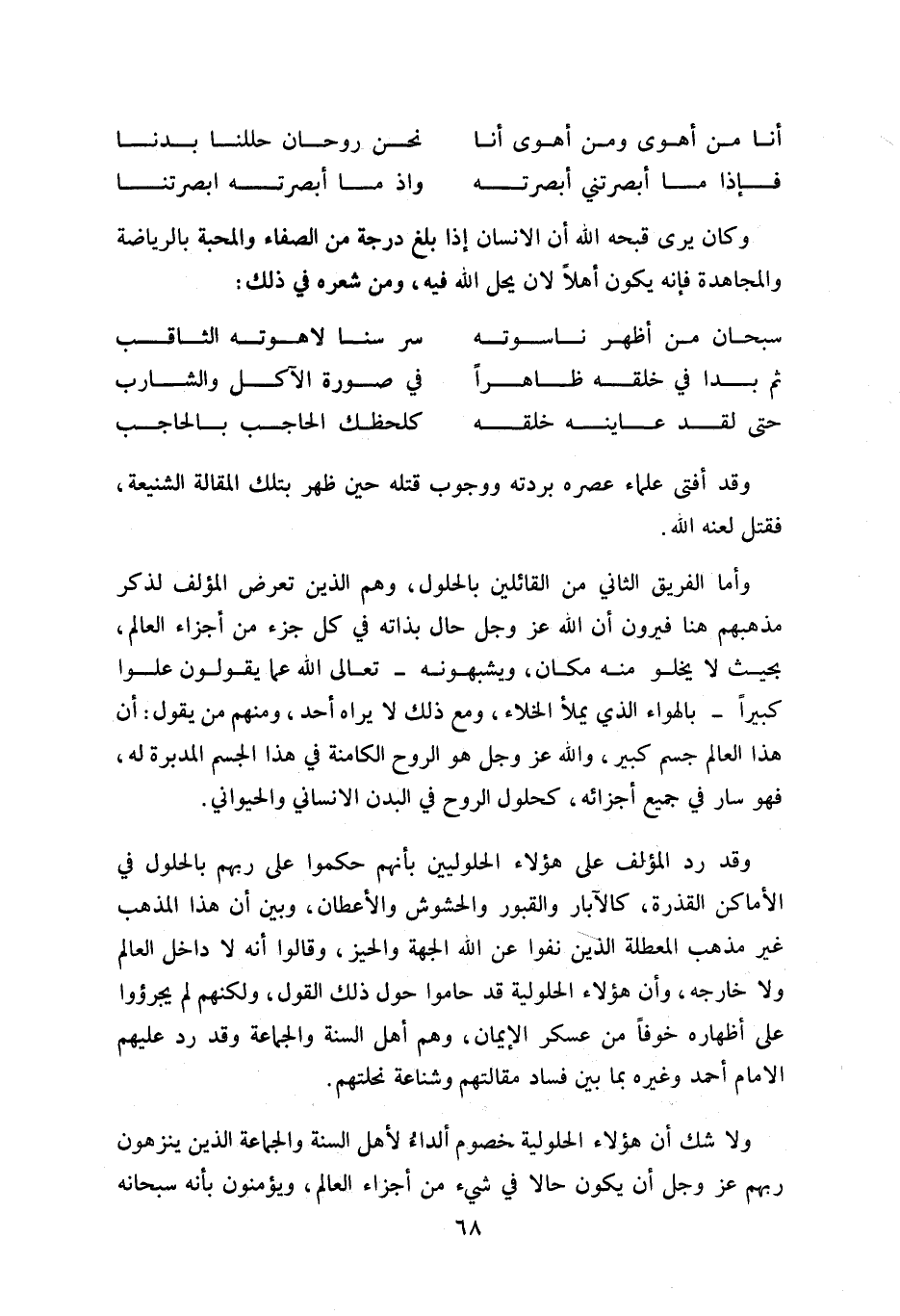 وكان يرى قبحه اللّه أن الانسان إذا بلغ درجة من الصفاء والمحبة بالرياضة والمجاهدة فإنه يكون أهلا لان يحل اللّه فيه، ومن شعره في ذلك: