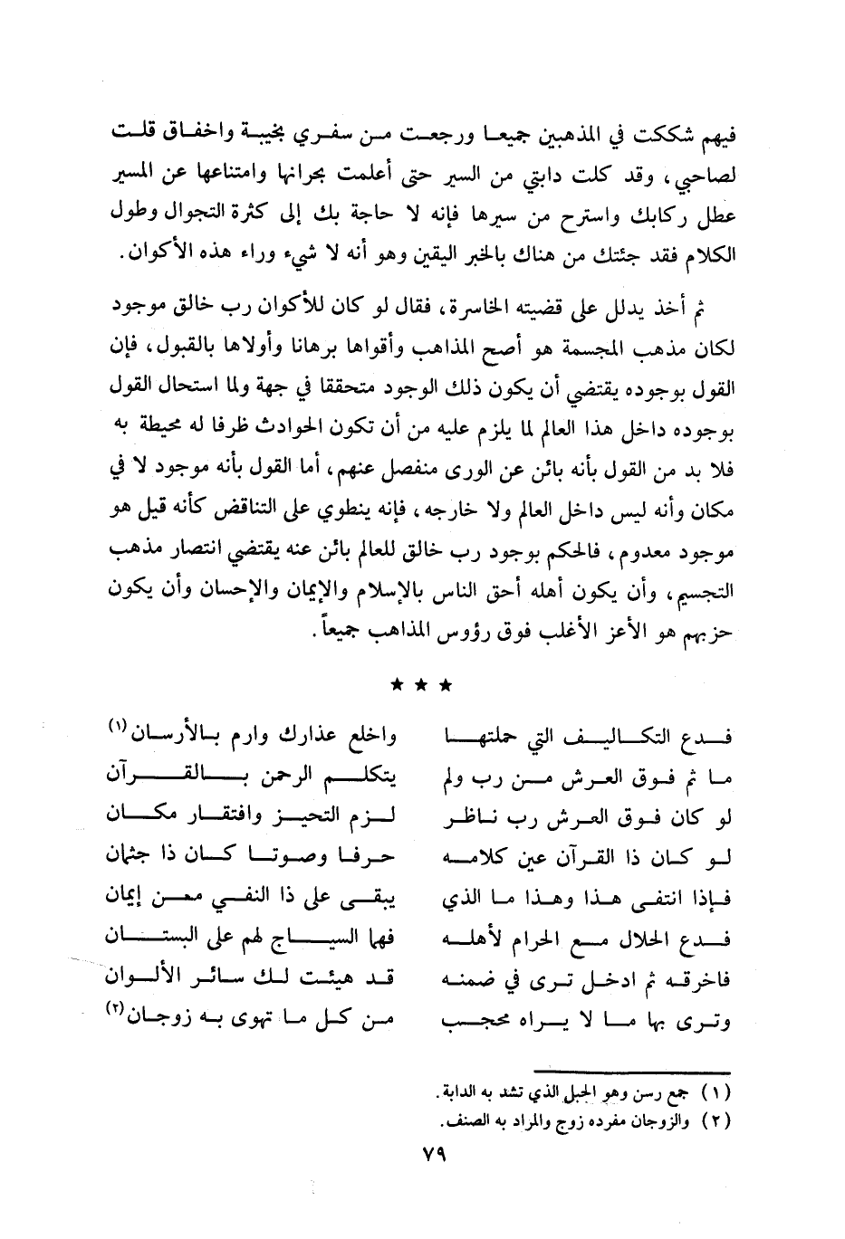فيهم شككت في المذهبين جميعا ورجعت من سفري بخيبة واخفاق قلت لصاحبي، وقد كلت دابتي من السير حتى أعلمت بحرانها وامتناعها عن المسير عطل ركابك واسترح من سيرها فإنه لا حاجة بك إلى كثرة التجوال وطول الكلام فقد جئتك من هناك بالخبر اليقين وهو أنه لا شي ء وراء هذه الأكوان.