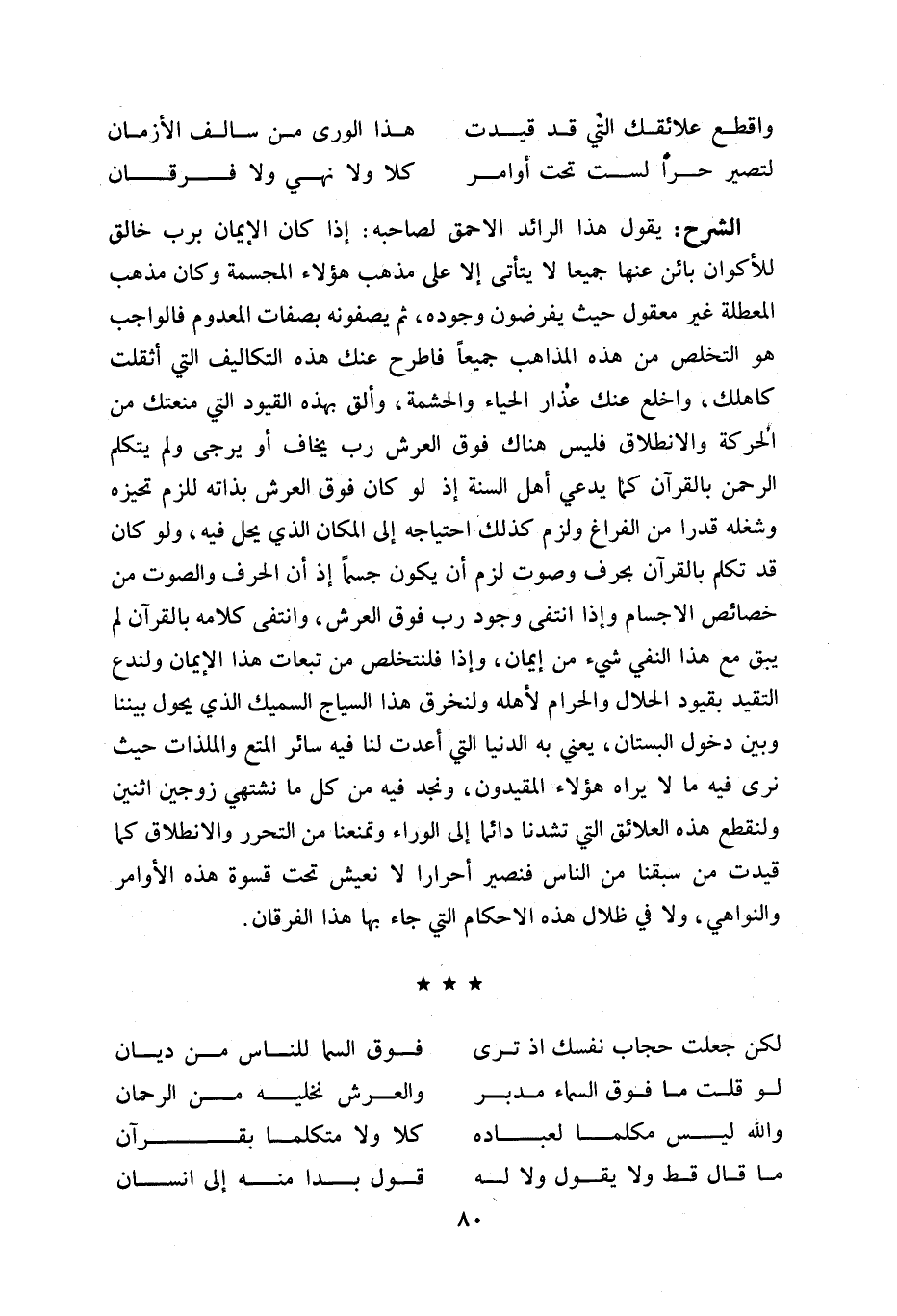 يقول هذا الرائد الاحمق لصاحبه: إذا كان الإيمان برب خالق للأكوان بائن عنها جميعا لا يتأتى إلا على مذهب هؤلاء المجسمة وكان مذهب المعطلة غير معقول حيث يفرضون وجوده، ثم يصفونه بصفات المعدوم فالواجب هو التخلص من هذه المذاهب جميعا فاطرح عنك هذه التكاليف التي أثقلت كاهلك، واخلع عنك عذار الحياء والحشمة، وألق بهذه القيود التي منعتك من الحركة والانطلاق فليس هناك فوق العرش رب يخاف أو يرجى ولم يتكلم الرحمن بالقرآن كما يدعي أهل السنة إذ لو كان فوق العرش بذاته للزم تحيزه وشغله قدرا من الفراغ ولزم كذلك احتياجه إلى المكان الذي يحل فيه، ولو كان قد تكلم بالقرآن بحرف وصوت لزم أن يكون جسما إذ أن الحرف والصوت من خصائص الاجسام وإذا انتفى وجود رب فوق العرش، وانتفى كلامه بالقرآن لم يبق مع هذا النفي شي ء من إيمان، وإذا فلنتخلص من تبعات هذا الإيمان ولندع التقيد بقيود الحلال والحرام لأهله ولنخرق هذا السياج السميك الذي يحول بيننا وبين دخول البستان، يعني به الدنيا التي أعدت لنا فيه سائر المتع والملذات حيث نرى فيه ما لا يراه هؤلاء المقيدون، ونجد فيه من كل ما نشتهي زوجين اثنين ولنقطع هذه العلائق التي تشدنا دائما إلى الوراء وتمنعنا من التحرر والانطلاق كما قيدت من سبقنا من الناس فنصير أحرارا لا نعيش تحت قسوة هذه الأوامر والنواهي، ولا في ظلال هذه الاحكام التي جاء بها هذا الفرقان.