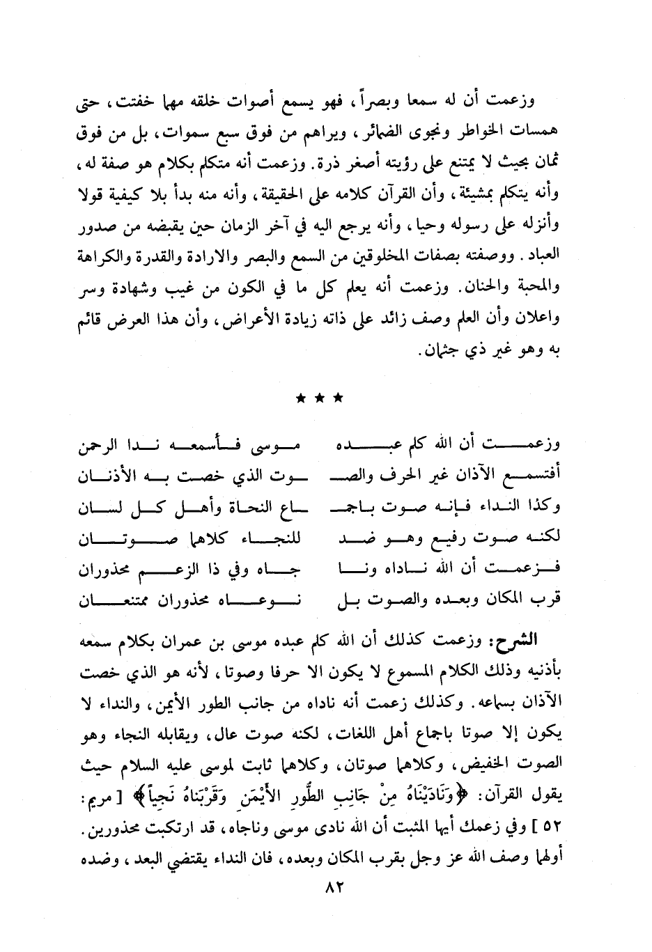 وزعمت كذلك أن اللّه كلم عبده موسى بن عمران بكلام سمعه بأذنيه وذلك الكلام المسموع لا يكون الا حرفا وصوتا، لأنه هو الذي خصت الآذان بسماعه. وكذلك زعمت أنه ناداه من جانب الطور الأيمن، والنداء لا يكون إلا صوتا باجماع أهل اللغات، لكنه صوت عال، ويقابله النجاء وهو الصوت الخفيض، وكلاهما صوتان، وكلاهما ثابت لموسى عليه السلام حيث يقول القرآن: ونادَيْناهُ مِنْ جانِبِ الطُّورِ الْأَيْمَنِ وقَرَّبْناهُ نَجِيًّا [مريم: