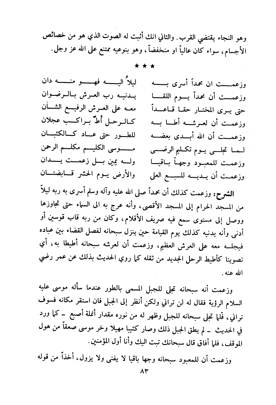 وزعمت كذلك أن محمدا صلى اللّه عليه وآله وسلم أسرى به ربه ليلا من المسجد الحرام إلى المسجد الأقصى، وأنه عرج به الى السماء حتى تجاوزها ووصل إلى مستوى سمع فيه صريف الأقلام، وكان من ربه قاب قوسين أو أدنى وأنه يدنيه كذلك يوم القيامة حين ينزل سبحانه لفصل القضاء بين عباده فيجلسه معه على العرش العظيم، وزعمت أن لعرشه سبحانه أطيطا به، أي تصويتا كأطيط الرحل الجديد من ثقله كما روي الحديث بذلك عن عمر رضي اللّه عنه.