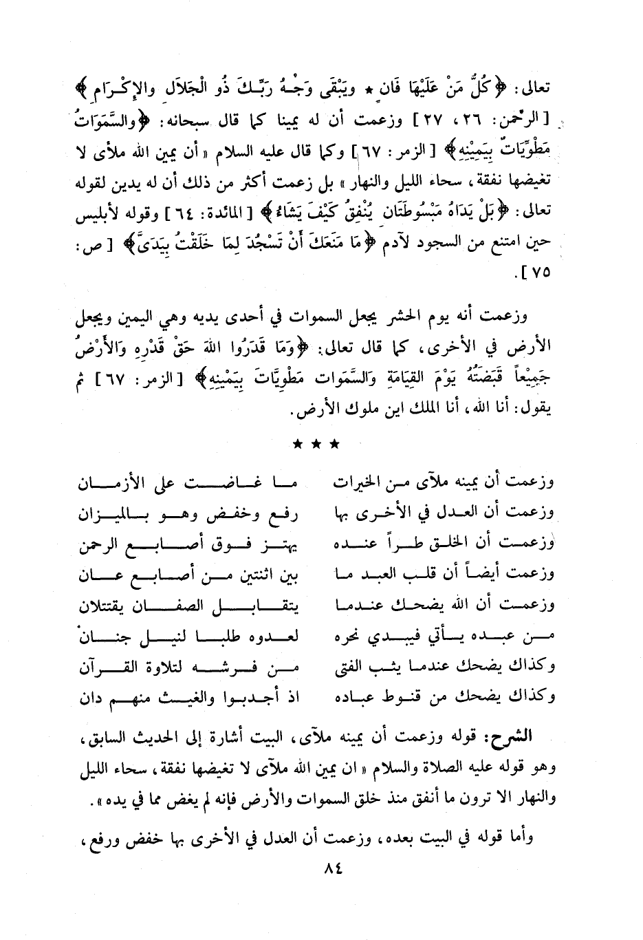 تعالى: كُلُّ مَنْ عَلَيْها فانٍ ويَبْقى وَجْهُ رَبِّكَ ذُو الْجَلالِ والْإِكْرامِ [الرّحمن: 26، 27] وزعمت أن له يمينا كما قال سبحانه: والسَّماواتُ مَطْوِيَّاتٌ بِيَمِينِهِ [الزمر: 67] وكما قال عليه السلام «أن يمين اللّه ملأى لا تغيضها نفقة، سحاء الليل والنهار» بل زعمت أكثر من ذلك أن له يدين لقوله تعالى: بَلْ يَداهُ مَبْسُوطَتانِ يُنْفِقُ كَيْفَ يَشاءُ [المائدة: 64] وقوله لإبليس حين امتنع من السجود لآدم ما مَنَعَكَ أَنْ تَسْجُدَ لِما خَلَقْتُ بِيَدَيَّ [ص: