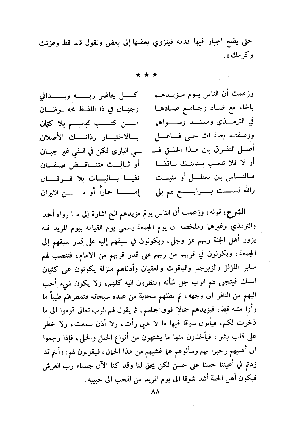 قوله: وزعمت أن الناس يوم مزيدهم الخ اشارة إلى ما رواه أحمد والترمذي وغيرهما وملخصه ان يوم الجمعة يسمى يوم القيامة بيوم المزيد فيه يزور أهل الجنة ربهم عز وجل، ويكونون في سبقهم إليه على قدر سبقهم إلى الجمعة، ويكونون في قربهم من ربهم على قدر قربهم من الامام، فتنصب لهم منابر اللؤلؤ والزبرجد والياقوت والعقيان وأدناهم منزلة يكونون على كثبان المسك فيتجلى لهم الرب جل شأنه وينظرون إليه كلهم، ولا يكون شي ء أحب إليهم من النظر الى وجهه، ثم تظلهم سحابة من عنده سبحانه فتمطرهم طيبا ما رأوا مثله قط، فيزيدهم جمالا فوق جمالهم، ثم يقول لهم الرب تعالى قوموا الى ما ذخرت لكم، فيأتون سوقا فيها ما لا عين رأت، ولا أذن سمعت، ولا خطر على قلب بشر، فيأخذون منها ما يشتهون من أنواع الحلل والحلى، فإذا رجعوا الى أهليهم رحبوا بهم وسألوهم عما غشيهم من هذا الجمال، فيقولون لهم: وأنتم قد زدتم في أعيننا حسنا على حسن لكن يحق لنا وقد كنا الآن جلساء رب العرش فيكون أهل الجنة أشد شوقا إلى يوم المزيد من المحب الى حبيبه.