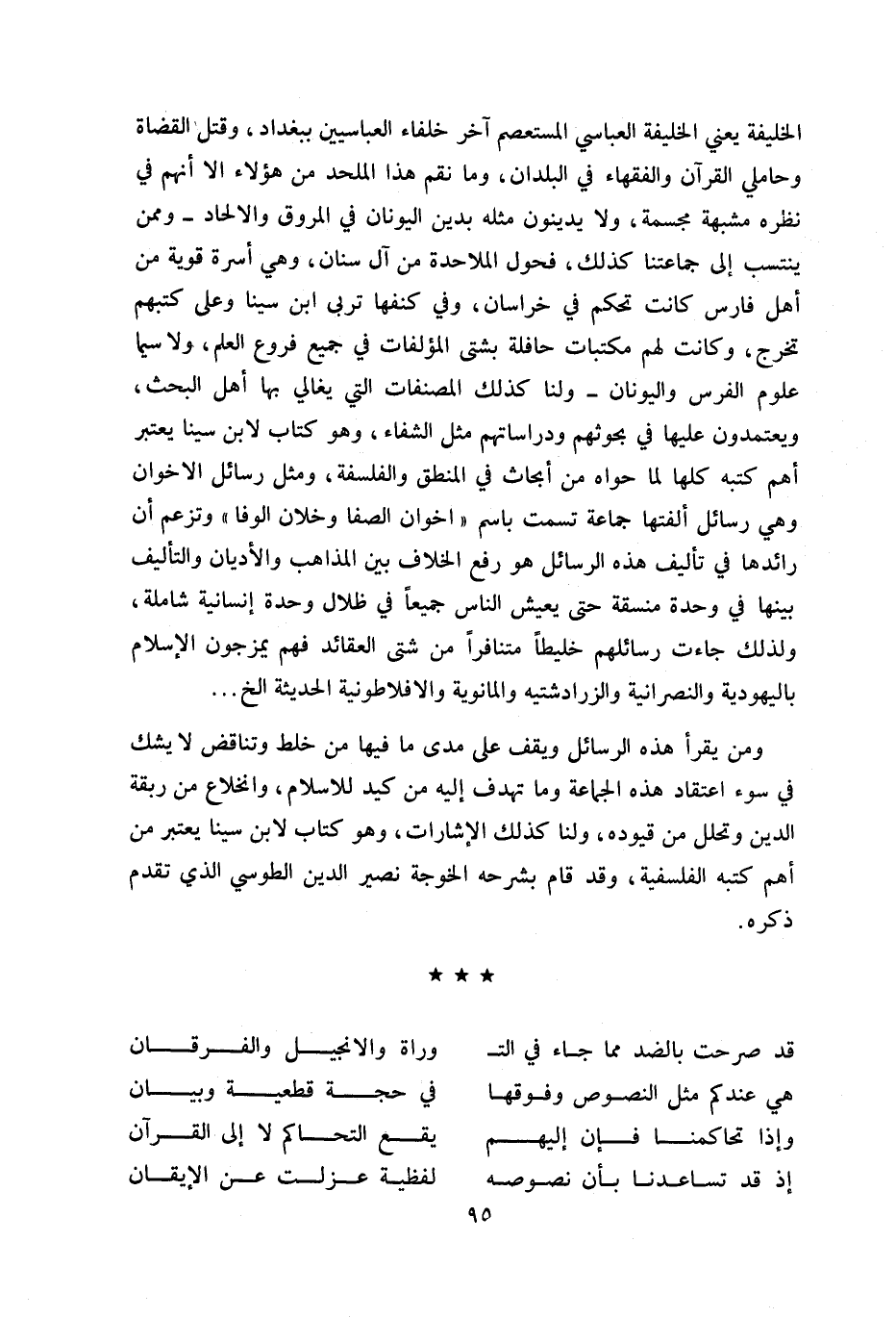 الخليفة يعني الخليفة العباسي المستعصم آخر خلفاء العباسيين ببغداد، وقتل القضاة وحاملي القرآن والفقهاء في البلدان، وما نقم هذا الملحد من هؤلاء الا أنهم في نظره مشبهة مجسمة، ولا يدينون مثله بدين اليونان في المروق والالحاد- وممن ينتسب إلى جماعتنا كذلك، فحول الملاحدة من آل سنان، وهي أسرة قوية من أهل فارس كانت تحكم في خراسان، وفي كنفها تربى ابن سينا وعلى كتبهم تخرج، وكانت لهم مكتبات حافلة بشتى المؤلفات في جميع فروع العلم، ولا سيما علوم الفرس واليونان- ولنا كذلك المصنفات التي يغالي بها أهل البحث، ويعتمدون عليها في بحوثهم ودراساتهم مثل الشفاء، وهو كتاب لابن سينا يعتبر أهم كتبه كلها لما حواه من أبحاث في المنطق والفلسفة، ومثل رسائل الاخوان وهي رسائل ألفتها جماعة تسمت باسم «اخوان الصفا وخلان الوفاء» وتزعم أن رائدها في تأليف هذه الرسائل هو رفع الخلاف بين المذاهب والأديان والتأليف بينها في وحدة منسقة حتى يعيش الناس جميعا في ظلال وحدة إنسانية شاملة، ولذلك جاءت رسائلهم خليطا متنافرا من شتى العقائد فهم يمزجون الإسلام باليهودية والنصرانية والزرادشتية والمانوية والافلاطونية الحديثة الخ ...