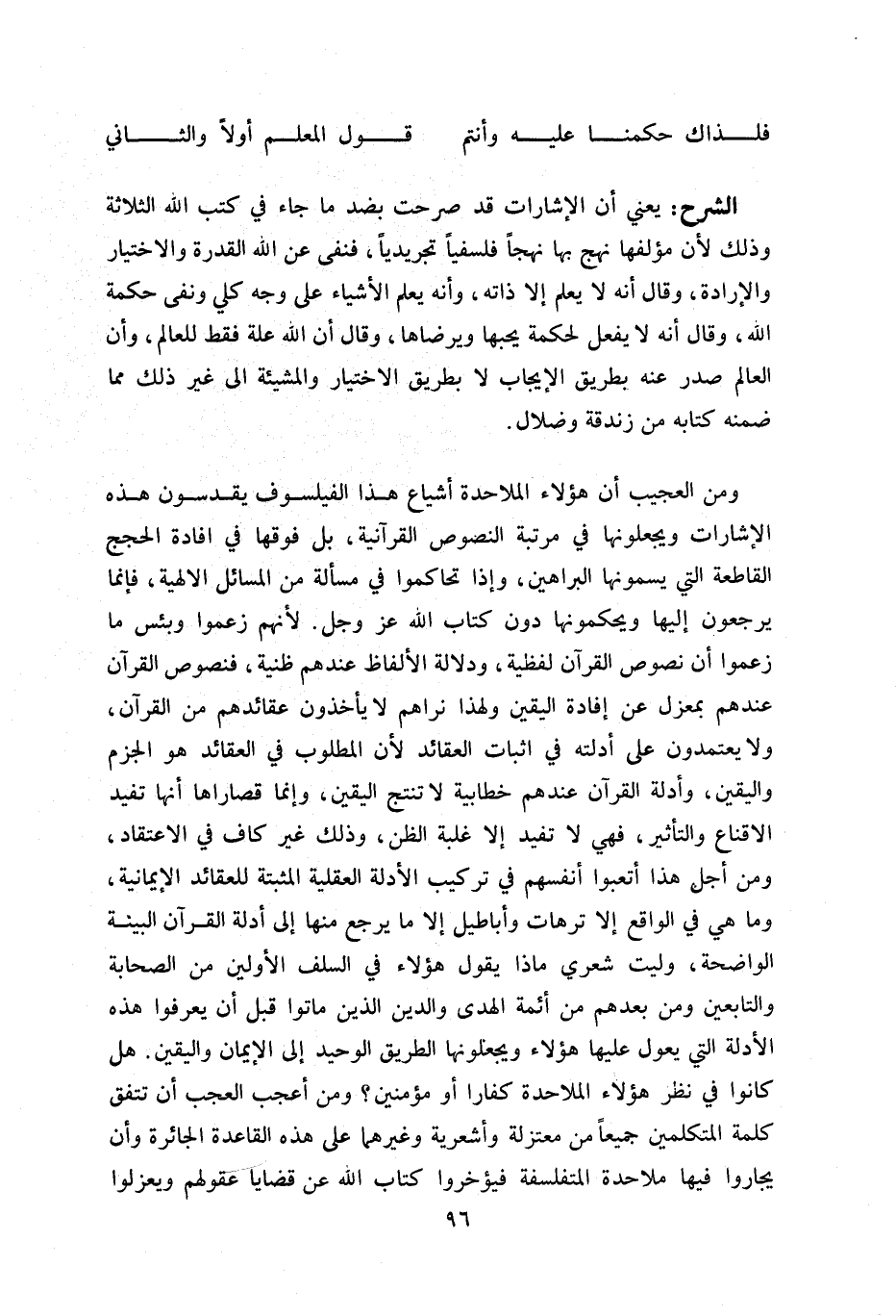 و من العجيب أن هؤلاء الملاحدة أشياع هذا الفيلسوف يقدسون هذه الإشارات ويجعلونها في مرتبة النصوص القرآنية، بل فوقها في افادة الحجج القاطعة التي يسمونها البراهين، وإذا تحاكموا في مسألة من المسائل الالهية، فإنما يرجعون إليها ويحكمونها دون كتاب اللّه عز وجل. لأنهم زعموا وبئس ما زعموا أن نصوص القرآن لفظية، ودلالة الألفاظ عندهم ظنية، فنصوص القرآن عندهم بمعزل عن إفادة اليقين ولهذا نراهم لا يأخذون عقائدهم من القرآن، ولا يعتمدون على أدلته في اثبات العقائد لأن المطلوب في العقائد هو الجزم واليقين، وأدلة القرآن عندهم خطابية لا تنتج اليقين، وإنما قصاراها أنها تفيد الاقناع والتأثير، فهي لا تفيد إلا غلبة الظن، وذلك غير كاف في الاعتقاد، ومن أجل هذا أتعبوا أنفسهم في تركيب الأدلة العقلية المثبتة للعقائد الإيمانية، وما هي في الواقع إلا ترهات وأباطيل إلا ما يرجع منها إلى أدلة القرآن البينة الواضحة، وليت شعري ما ذا يقول هؤلاء في السلف الأولين من الصحابة والتابعين ومن بعدهم من أئمة الهدى والدين الذين ماتوا قبل أن يعرفوا هذه الأدلة التي يعول عليها هؤلاء ويجعلونها الطريق الوحيد إلى الإيمان واليقين. هل كانوا في نظر هؤلاء الملاحدة كفارا أو مؤمنين؟ ومن أعجب العجب أن تتفق كلمة المتكلمين جميعا من معتزلة وأشعرية وغيرهما على هذه القاعدة الجائرة وأن يجاروا فيها ملاحدة المتفلسفة فيؤخروا كتاب اللّه عن قضايا عقولهم ويعزلوا