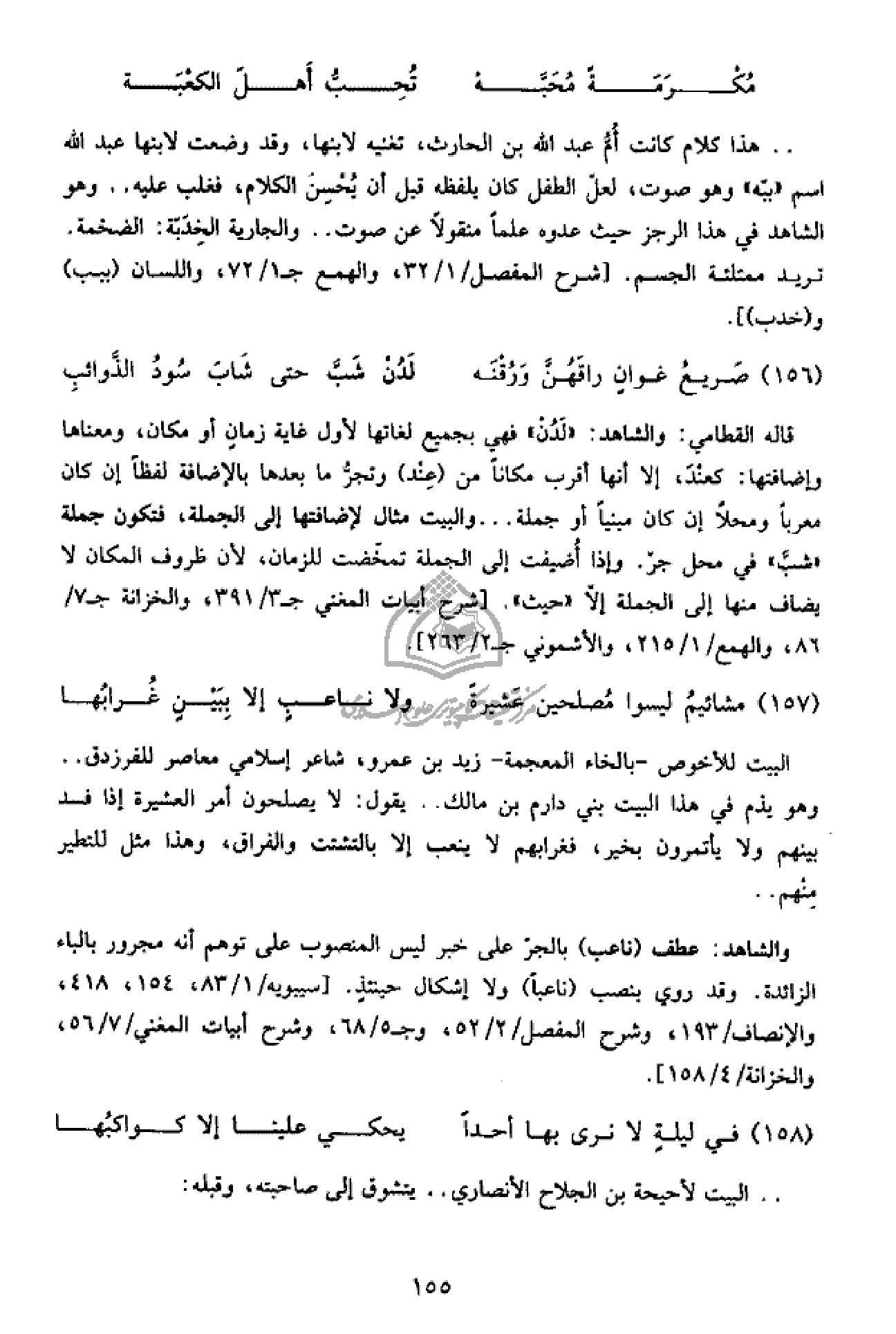 قاله القطامي: والشاهد: «لدن» فهي بجميع لغاتها لأول غاية زمان أو مكان، ومعناها وإضافتها: كعند، إلا أنها أقرب مكانا من (عند) وتجرّ ما بعدها بالإضافة لفظا إن كان معربا ومحلا إن كان مبنيا أو جملة ... والبيت مثال لإضافتها إلى الجملة، فتكون جملة «شبّ» في محل جرّ. وإذا أضيفت إلى الجملة تمخّضت للزمان، لأن ظروف المكان لا يضاف منها إلى الجملة إلّا «حيث». [شرح أبيات المغني ج 3/ 391، والخزانة ج 7/ 86، والهمع/ 1/ 215، والأشموني ج 2/ 263].