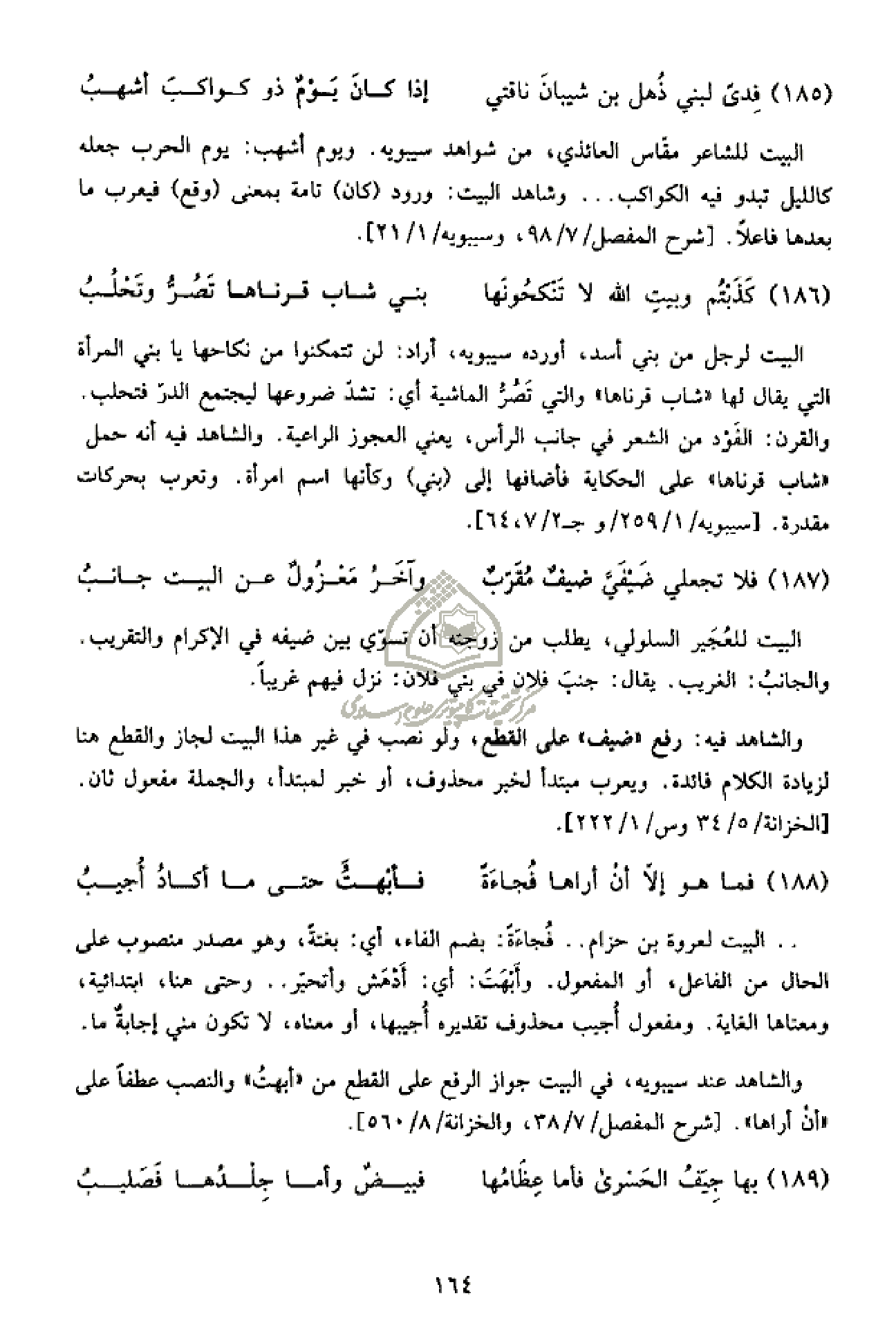 والقرن: الفود من الشعر في جانب الرأس، يعني العجوز الراعية. والشاهد فيه أنه حمل «شاب قرناها» على الحكاية فأضافها إلى (بني) وكأنها اسم امرأة. وتعرب بحركات مقدرة. [سيبويه/ 1/ 259 / وج 2/ 7، 64].