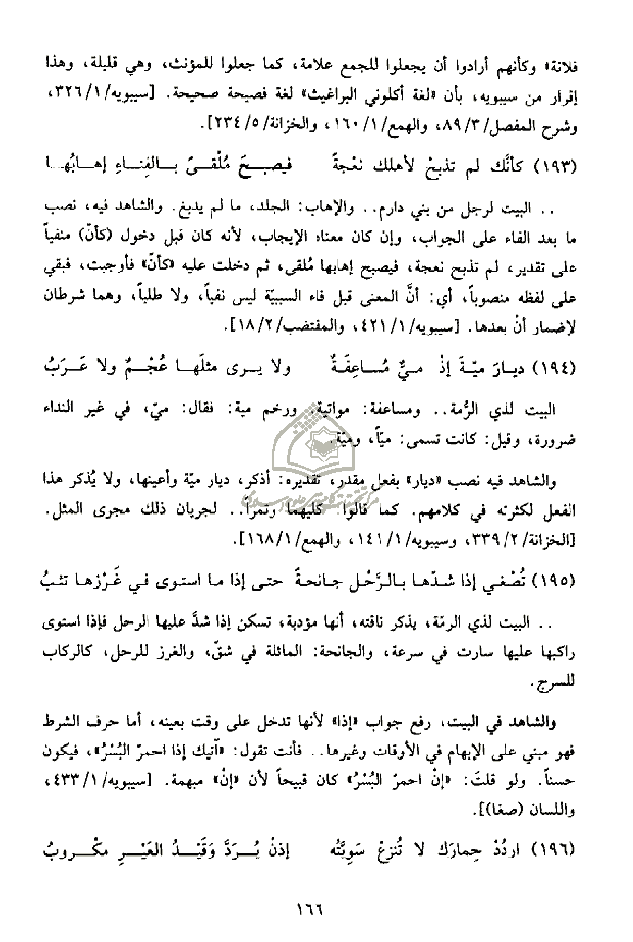 .. البيت لرجل من بني دارم .. والإهاب: الجلد، ما لم يدبغ. والشاهد فيه، نصب ما بعد الفاء على الجواب، وإن كان معناه الإيجاب، لأنه كان قبل دخول (كأنّ) منفيا على تقدير، لم تذبح نعجة، فيصبح إهابها ملقى، ثم دخلت عليه «كأنّ» فأوجبت، فبقي على لفظه منصوبا، أي: أنّ المعنى قبل فاء السببيّة ليس نفيا، ولا طلبا، وهما شرطان لإضمار أن بعدها. [سيبويه/ 1/ 421، والمقتضب/ 2/ 18].