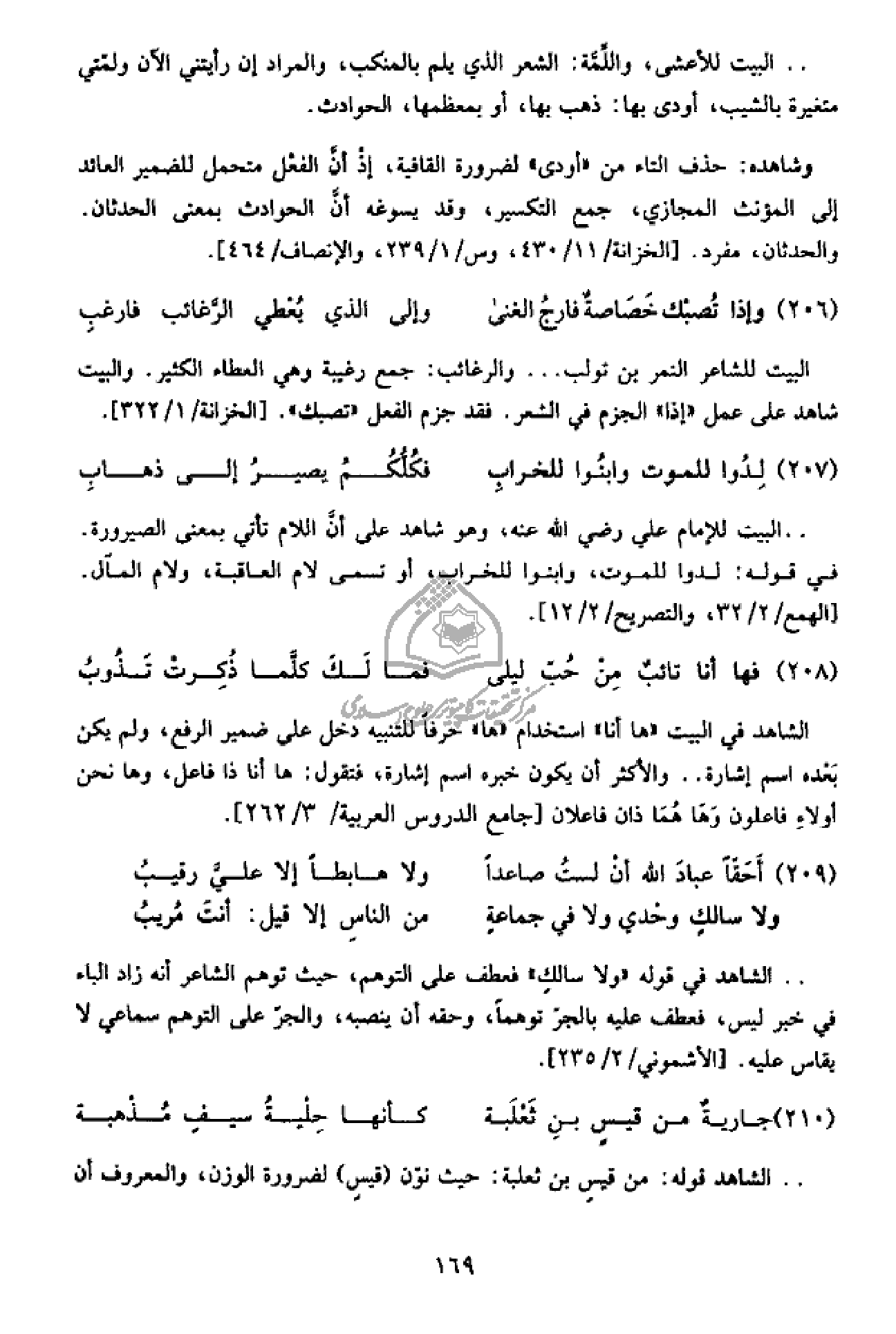 وشاهده: حذف التاء من «أودى» لضرورة القافية، إذ أنّ الفعل متحمل للضمير العائد إلى المؤنث المجازي، جمع التكسير، وقد يسوغه أنّ الحوادث بمعنى الحدثان.