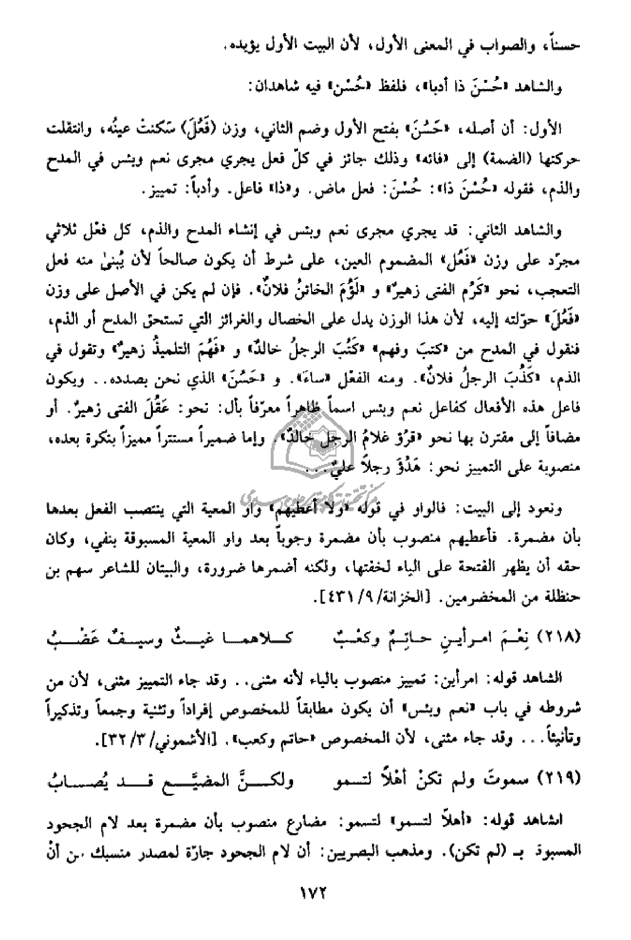 والشاهد الثاني: قد يجري مجرى نعم وبئس في إنشاء المدح والذم، كل فعل ثلاثي مجرّد على وزن «فعل» المضموم العين، على شرط أن يكون صالحا لأن يبنى منه فعل التعجب، نحو «كرم الفتى زهير» و «لؤم الخائن