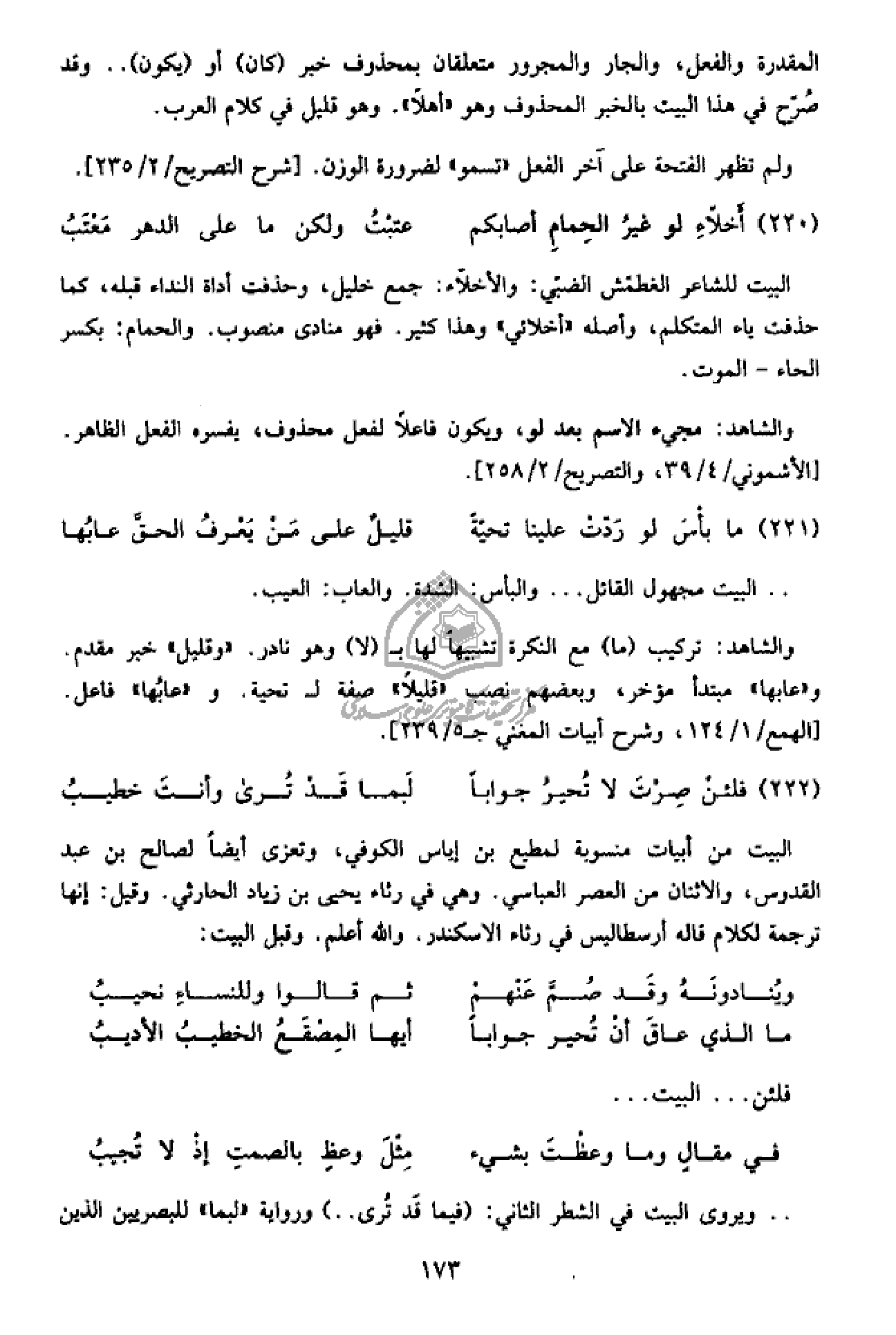 البيت للشاعر الغطمّش الضبّي: والأخلّاء: جمع خليل، وحذفت أداة النداء قبله، كما حذفت ياء المتكلم، وأصله «أخلائي» وهذا كثير. فهو منادى منصوب. والحمام: بكسر الحاء - الموت.