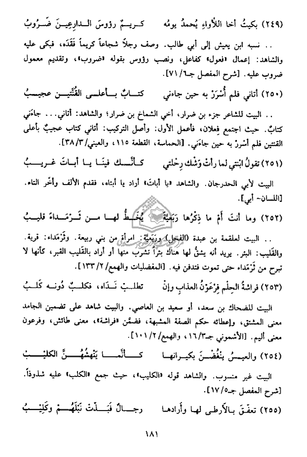 .. نسبه ابن يعيش إلى أبي طالب. وصف رجلا شجاعا كريما فقده، فبكى عليه والشاهد: إعمال «فعول» كفاعل، ونصب رؤوس بقوله «ضروب»، وتقديم معمول ضروب عليه. [شرح المفصل ج 6/ 71].