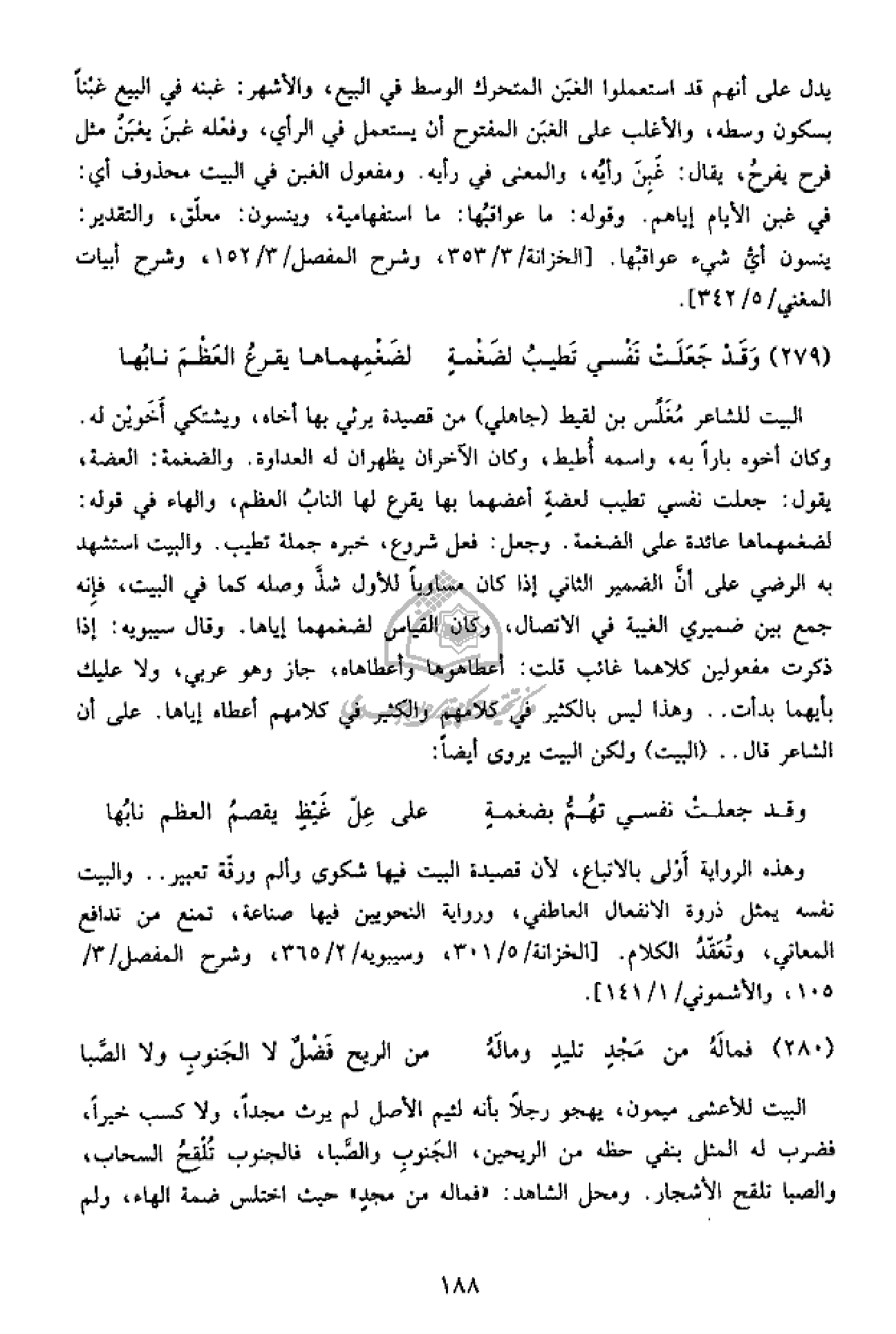 وهذه الرواية أولى بالاتباع، لأن قصيدة البيت فيها شكوى وألم ورقّة تعبير .. والبيت نفسه يمثل ذروة الانفعال العاطفي، ورواية النحويين فيها صناعة، تمنع من تدافع المعاني، وتعقّد الكلام. [الخزانة/ 5/ 301، وسيبويه/ 2/ 365، وشرح المفصل/ 3/ 105، والأشموني/ 1/ 141].