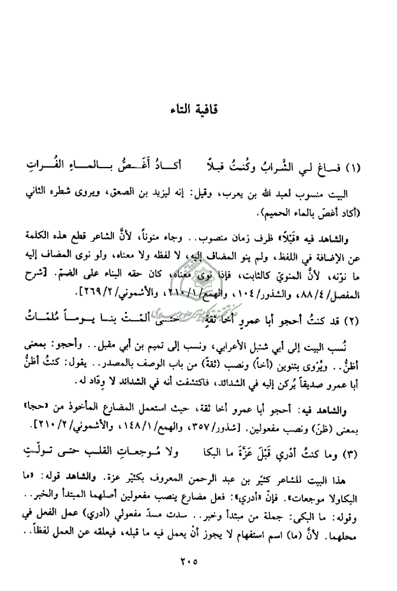 والشاهد فيه «قبلا» ظرف زمان منصوب .. وجاء منونا، لأنّ الشاعر قطع هذه الكلمة عن الإضافة في اللفظ، ولم ينو المضاف إليه، لا لفظه ولا معناه، ولو نرى المضاف إليه ما نوّنه، لأنّ المنويّ كالثابت، فإذا نوى معناه، كان حقه البناء على الضمّ. [شرح المفصل/ 4/ 88، والشذور/ 104، والهمع/ 1/ 210، والأشموني/ 2/ 269].