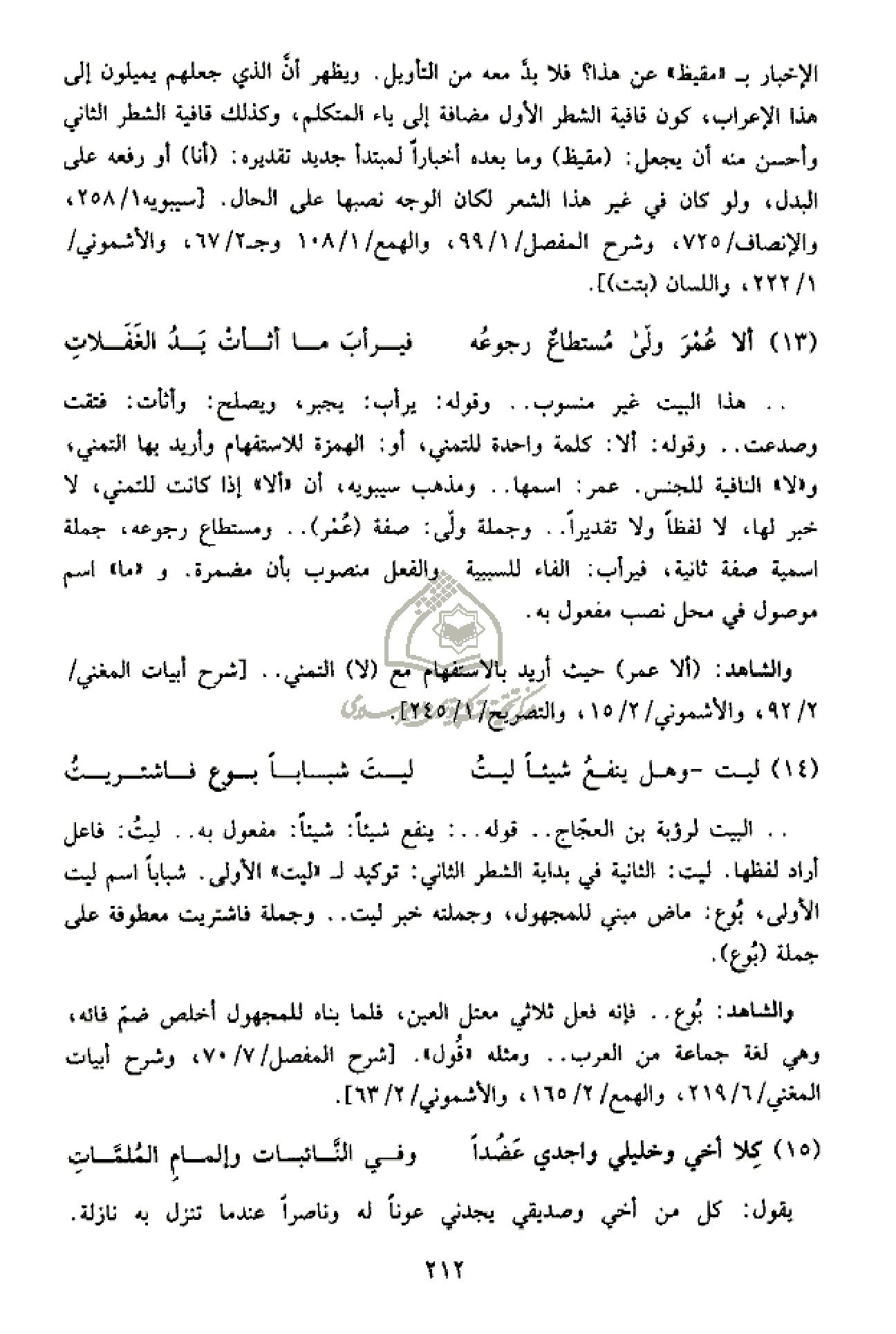 .. هذا البيت غير منسوب .. وقوله: يرأب: يجبر، ويصلح: وأثأت: فتقت وصدعت .. وقوله: ألا: كلمة واحدة للتمني، أو: الهمزة للاستفهام وأريد بها التمني، و «لا» النافية للجنس. عمر: اسمها .. ومذهب سيبويه، أن «ألا» إذا كانت للتمني، لا خبر لها، لا لفظا ولا تقديرا .. وجملة ولّى: صفة (عمر) .. ومستطاع رجوعه، جملة اسمية صفة ثانية، فيرأب: الفاء للسببية والفعل منصوب بأن مضمرة. و «ما» اسم موصول في محل نصب مفعول به.