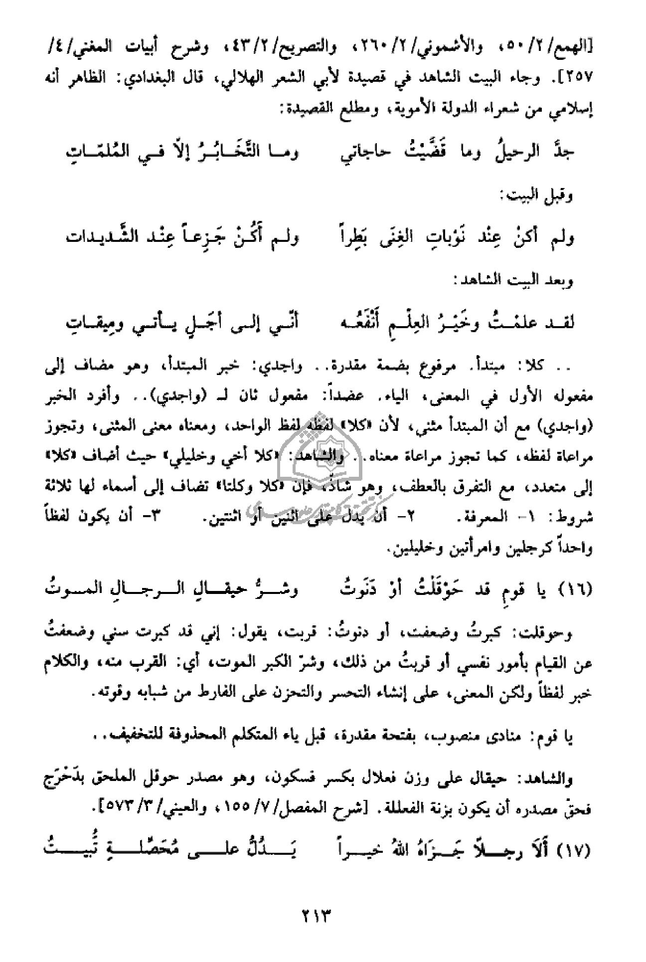 .. كلا: مبتدأ. مرفوع بضمة مقدرة .. واجدي: خبر المبتدأ، وهو مضاف إلى مفعوله الأول في المعنى، الياء. عضدا: مفعول ثان ل (واجدي) .. وأفرد الخبر (واجدي) مع أن المبتدأ مثنى، لأن «كلا» لفظه لفظ الواحد، ومعناه معنى المثنى، وتجوز مراعاة لفظه، كما تجوز مراعاة معناه .. والشاهد: «كلا أخي وخليلي» حيث أضاف «كلا» إلى متعدد، مع التفرق بالعطف، وهو شاذّ، فإن «كلا وكلتا» تضاف إلى أسماء لها ثلاثة شروط: