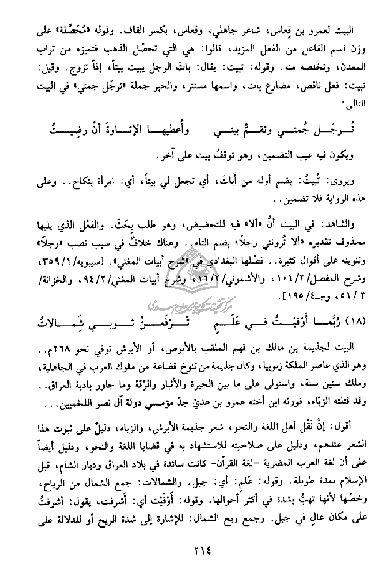 أقول: إنّ نقل أهل اللغة والنحو، شعر جذيمة الأبرش، والزباء، دليل على ثبوت هذا الشعر عندهم، ودليل على صلاحيته للاستشهاد به في قضايا اللغة والنحو، ودليل أيضا على أن لغة العرب المضرية - لغة القرآن - كانت سائدة في بلاد العراق وديار الشام، قبل الإسلام بمدة طويلة. وقوله: علم: أي: جبل. والشمالات: جمع الشمال من الرياح، وخصّها لأنها تهبّ بشدة في أكثر أحوالها. وقوله: أوفيت أي: أشرفت، يقول: أشرفت على مكان عال في جبل. وجمع ريح الشمال: للإشارة إلى شدة الريح أو للدلالة على