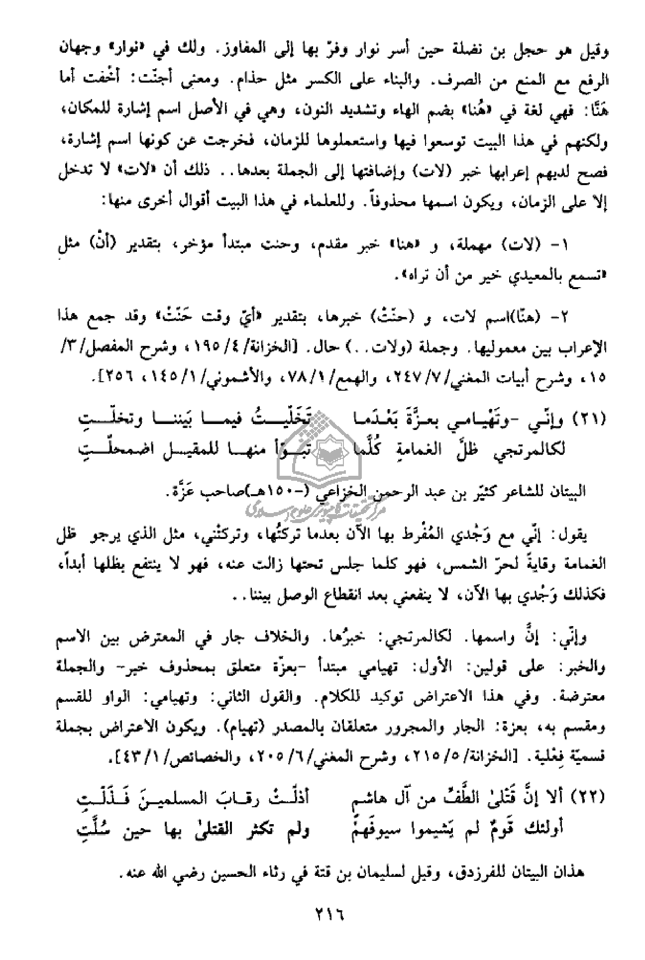 وقيل هو حجل بن نضلة حين أسر نوار وفرّ بها إلى المفاوز. ولك في «نوار» وجهان الرفع مع المنع من الصرف. والبناء على الكسر مثل حذام. ومعنى أجنّت: أخفت أما هنّا: فهي لغة في «هنا» بضم الهاء وتشديد النون، وهي في الأصل اسم إشارة للمكان، ولكنهم في هذا البيت توسعوا فيها واستعملوها للزمان، فخرجت عن كونها اسم إشارة، فصح لديهم إعرابها خبر (لات) وإضافتها إلى الجملة بعدها .. ذلك أن «لات» لا تدخل إلا على الزمان، ويكون اسمها محذوفا. وللعلماء في هذا البيت أقوال أخرى منها: